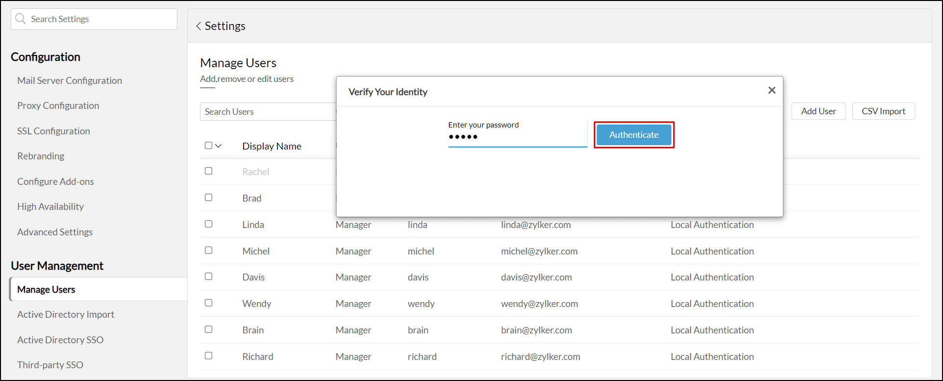 Analytics Plus enables you to manage all your users from the Manage Users tab on the Settings page. All users added to the Analytics Plus application will be listed here. You can edit, enable SSO, remove, change user roles, activate, deactivate, and reset password for users from here.