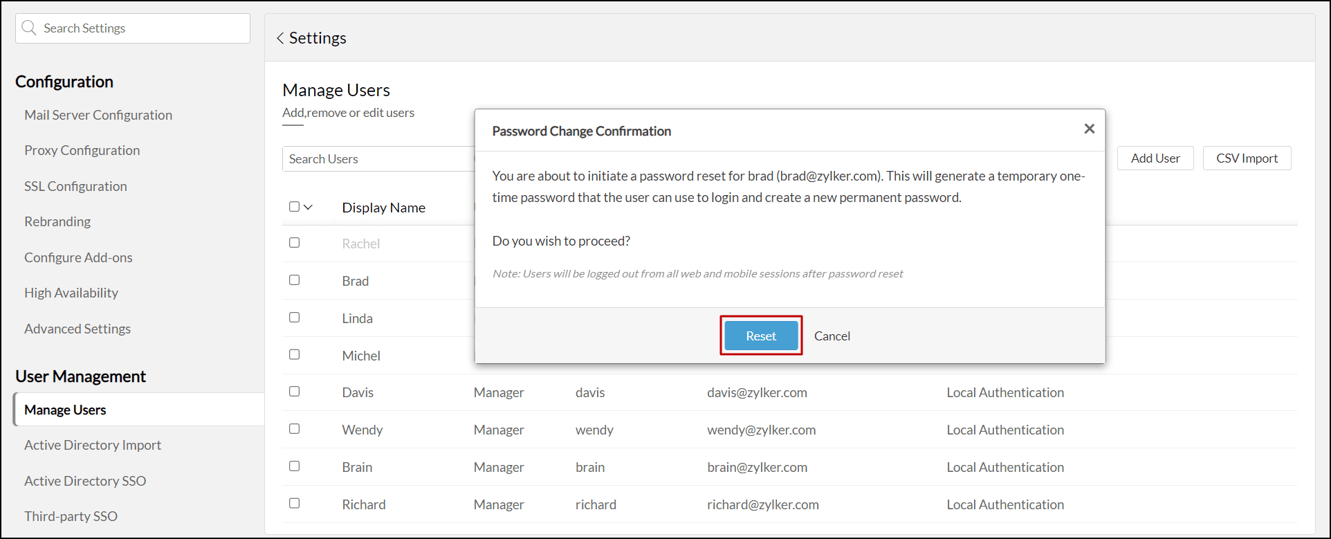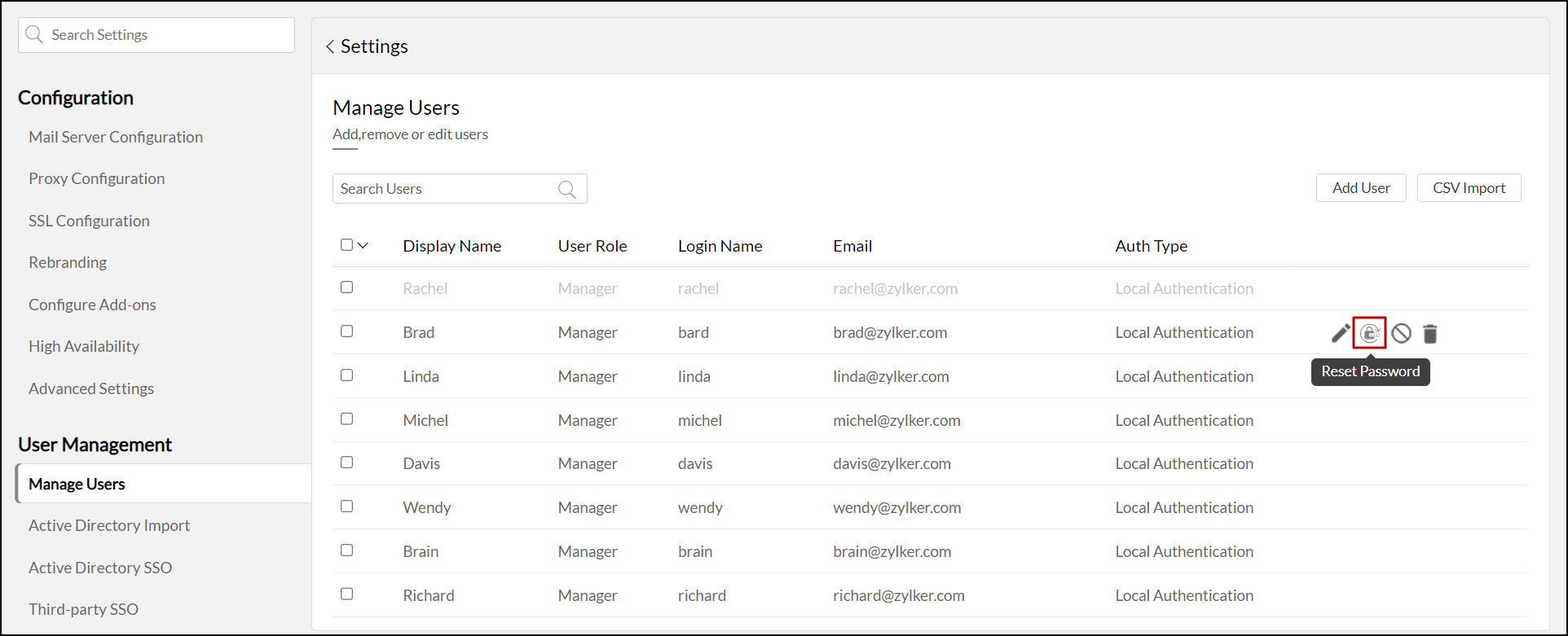 - Click the Reset Password icon that appears on mouse over the required user name.