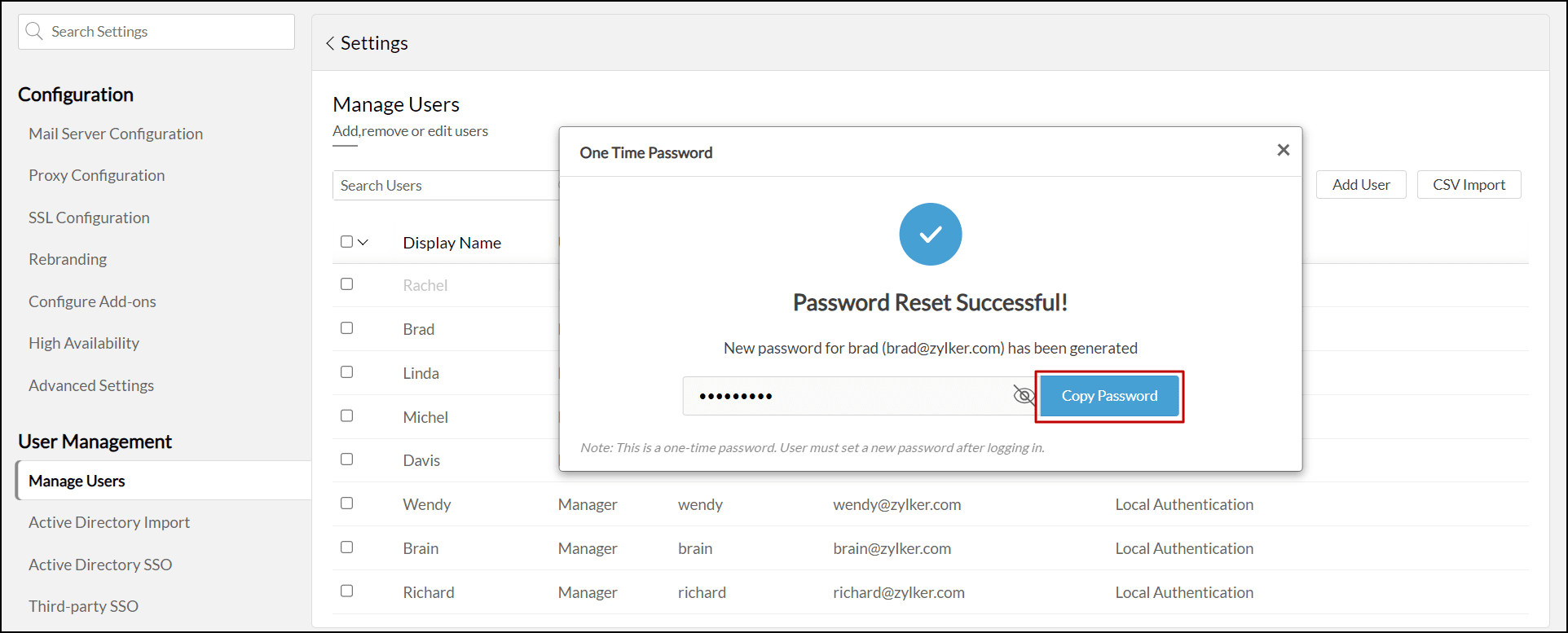 - Click Copy Password to copy the temporary one-time password and share it with the corresponding user.