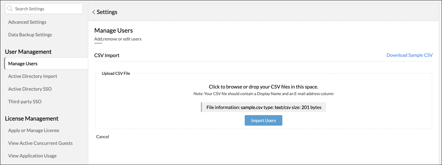 - In the page that appears, browse and select the CSV file, and click Import Users.