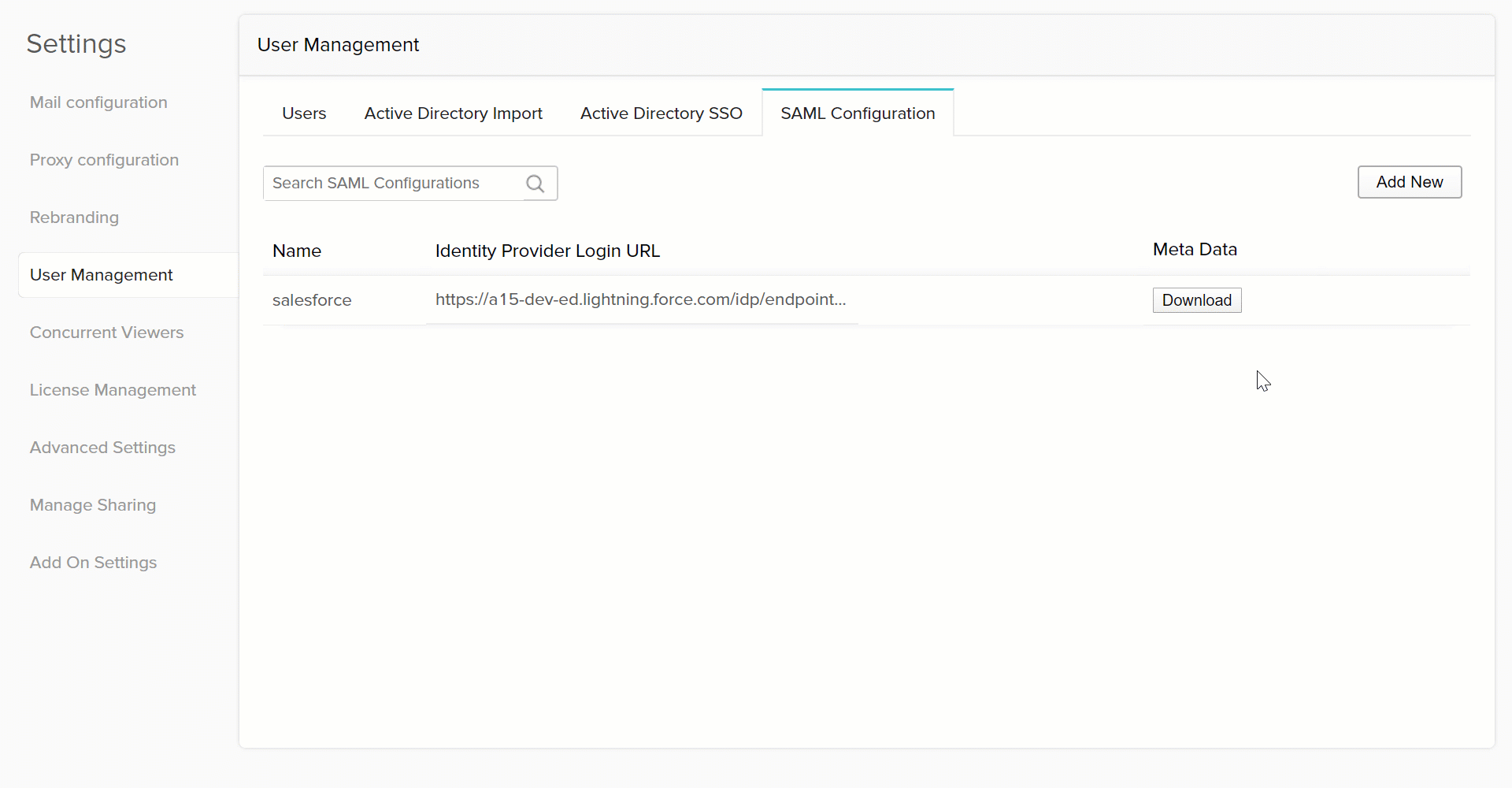The Server Administrator can import, delete, activate or deactivate users, from the User Management page. You can import Active Directory users and enable single sign-on functionality for them using the Active Directory tabs. To learn more about Active Directory, click here. The SAML configuration tab can be used to configure single sign-on with third-party applications. To learn more about setting up a SAML configuration, click here.