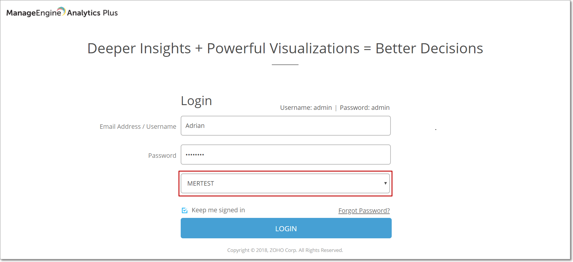 Note: Active Directory users need to select their appropriate Active Directory domain while logging in to Analytics Plus.