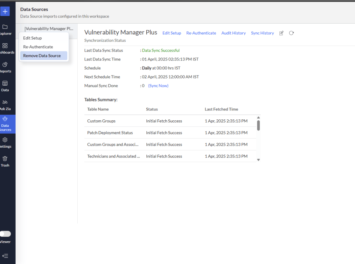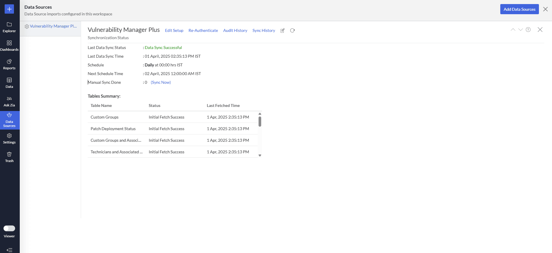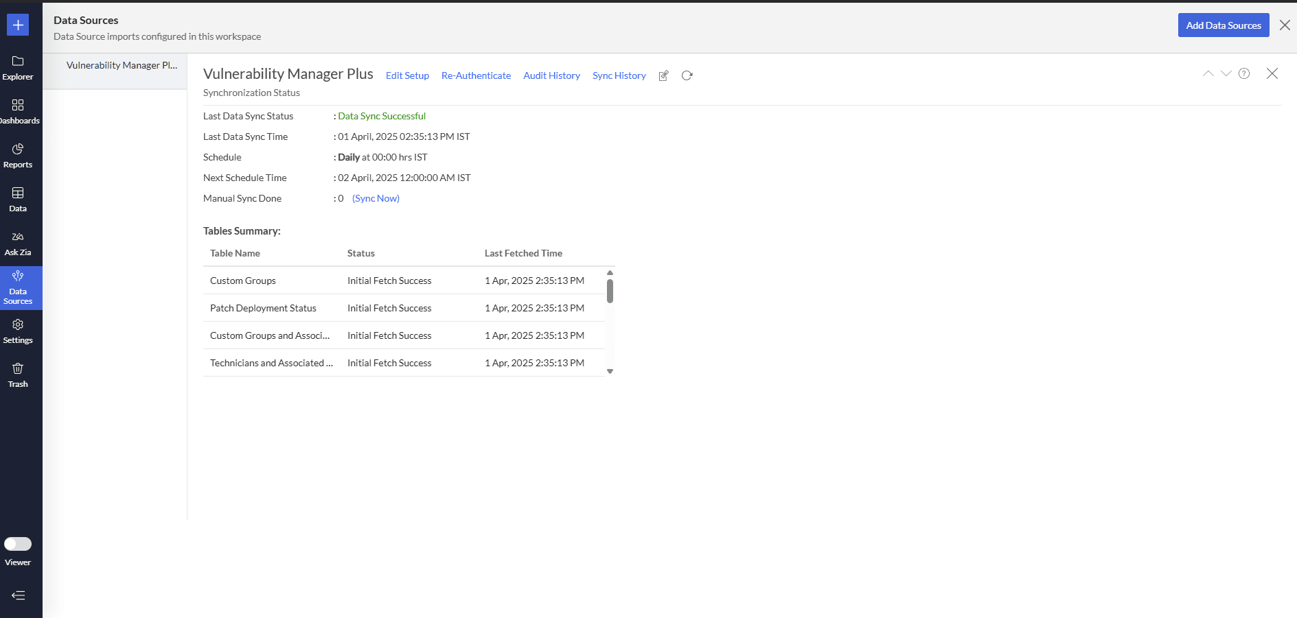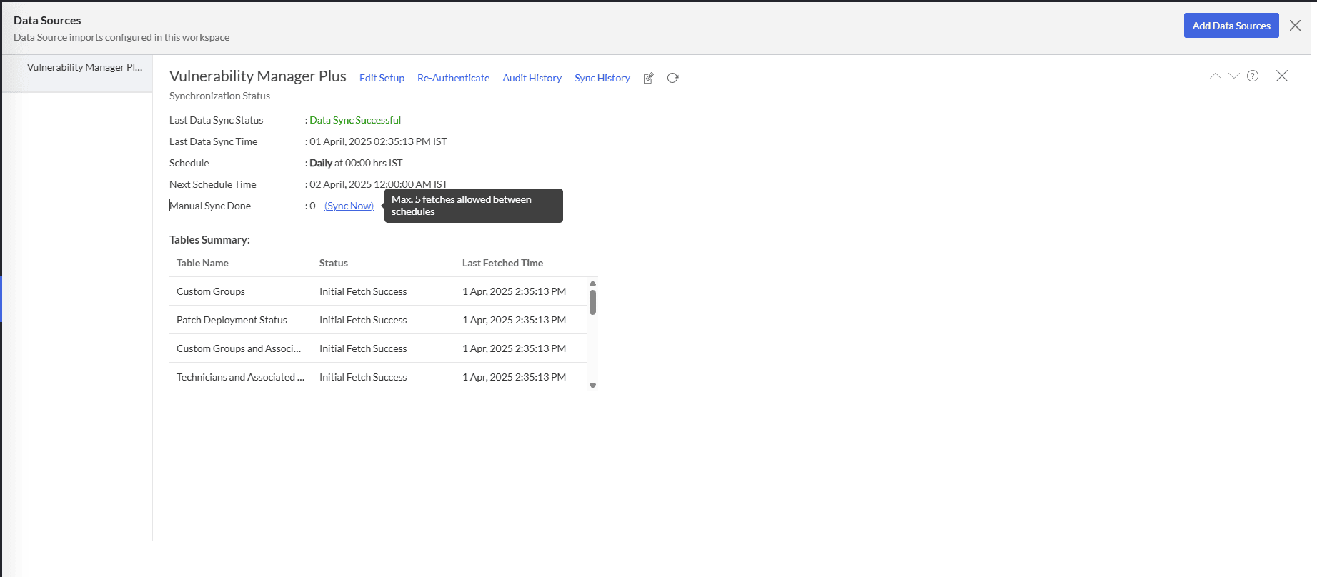 You can also access the Vulnerability Manager Plus data source page, and click Sync Now.