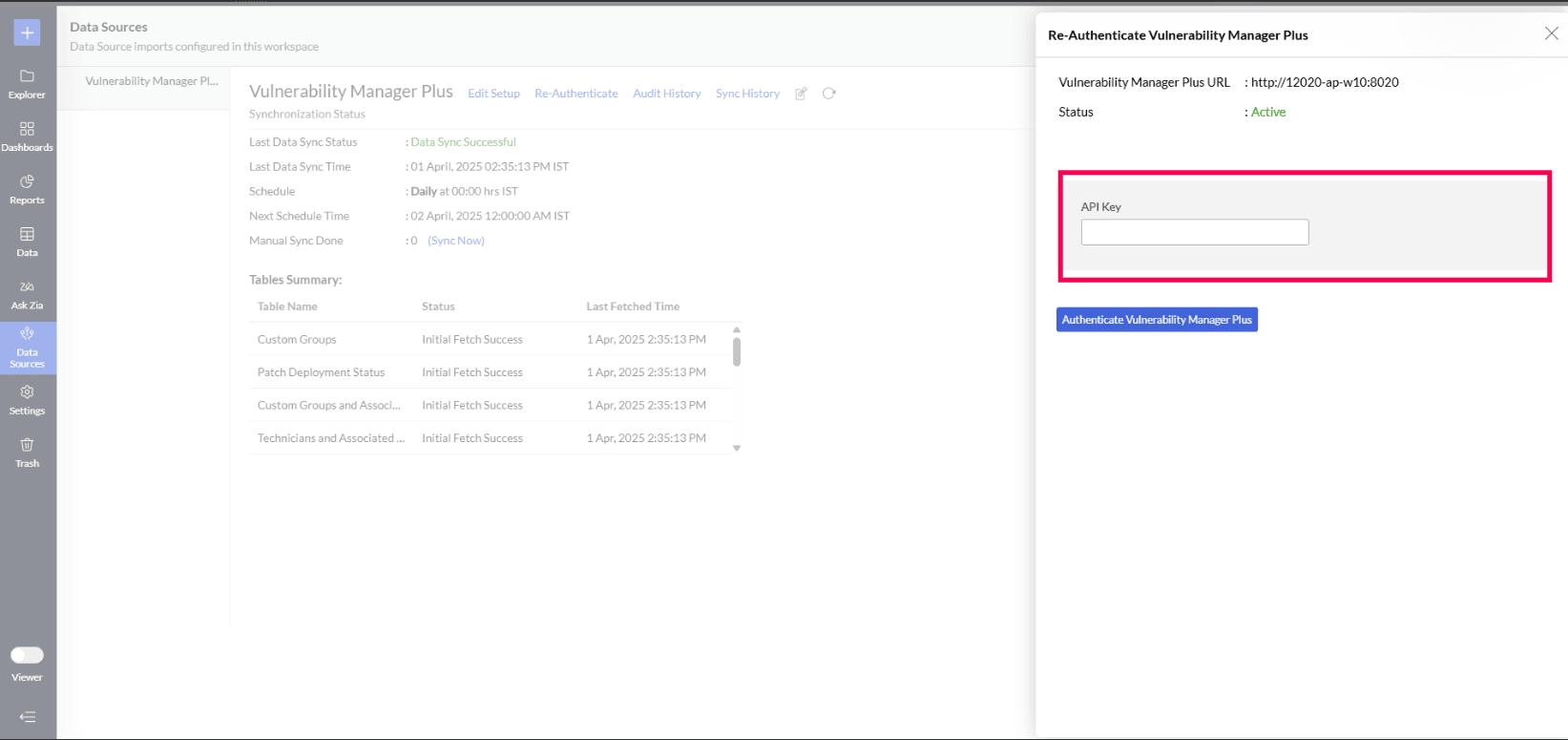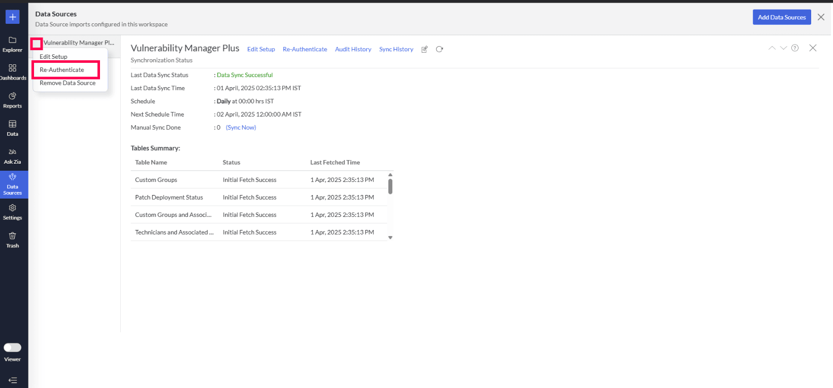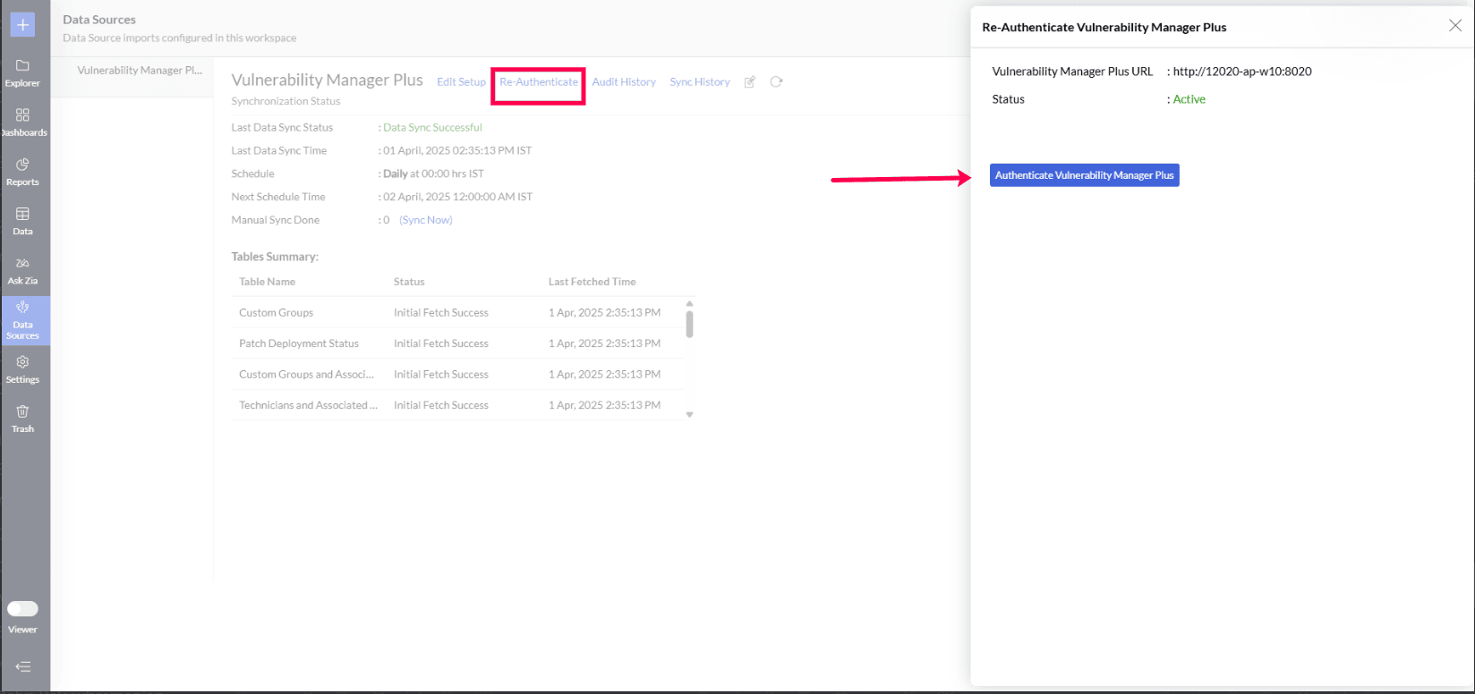 Navigate to the Vulnerability Manager Plus data source, and click the Re-Authenticate link.