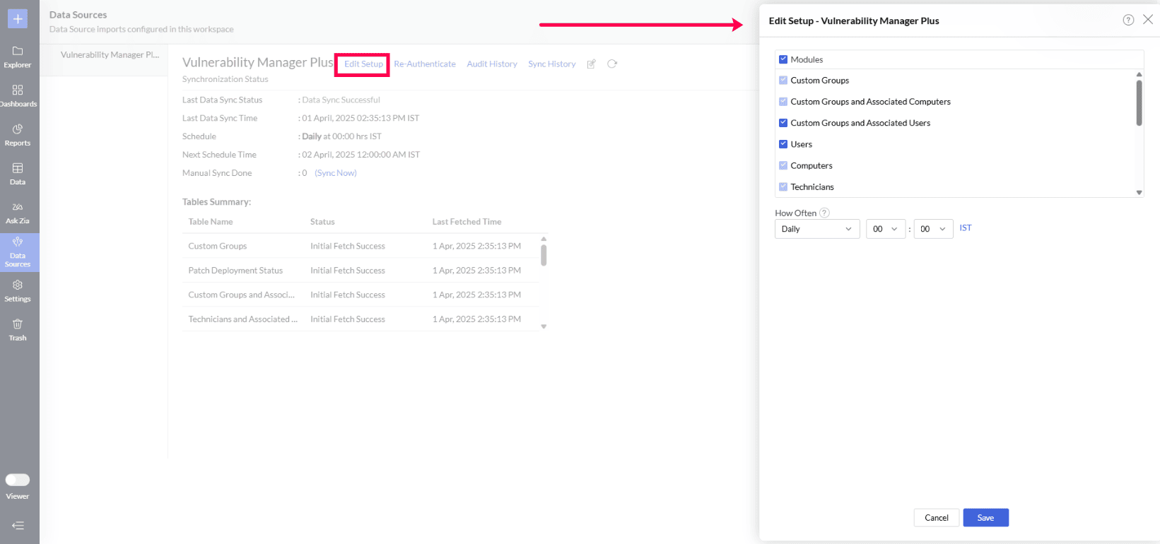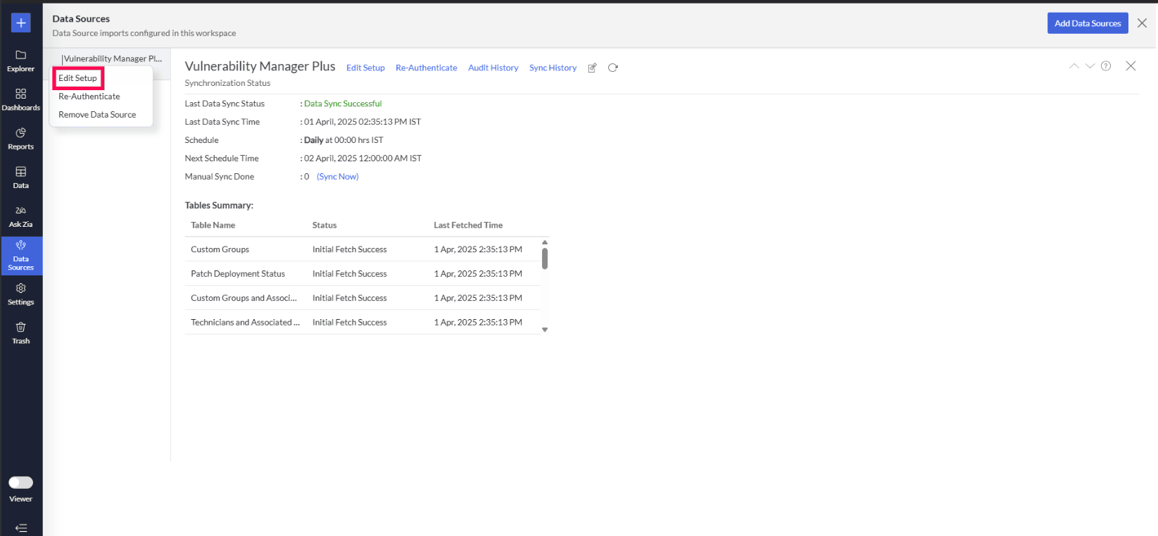 Navigate to the Vulnerability Manager Plus data source, and click the Edit Setup link.