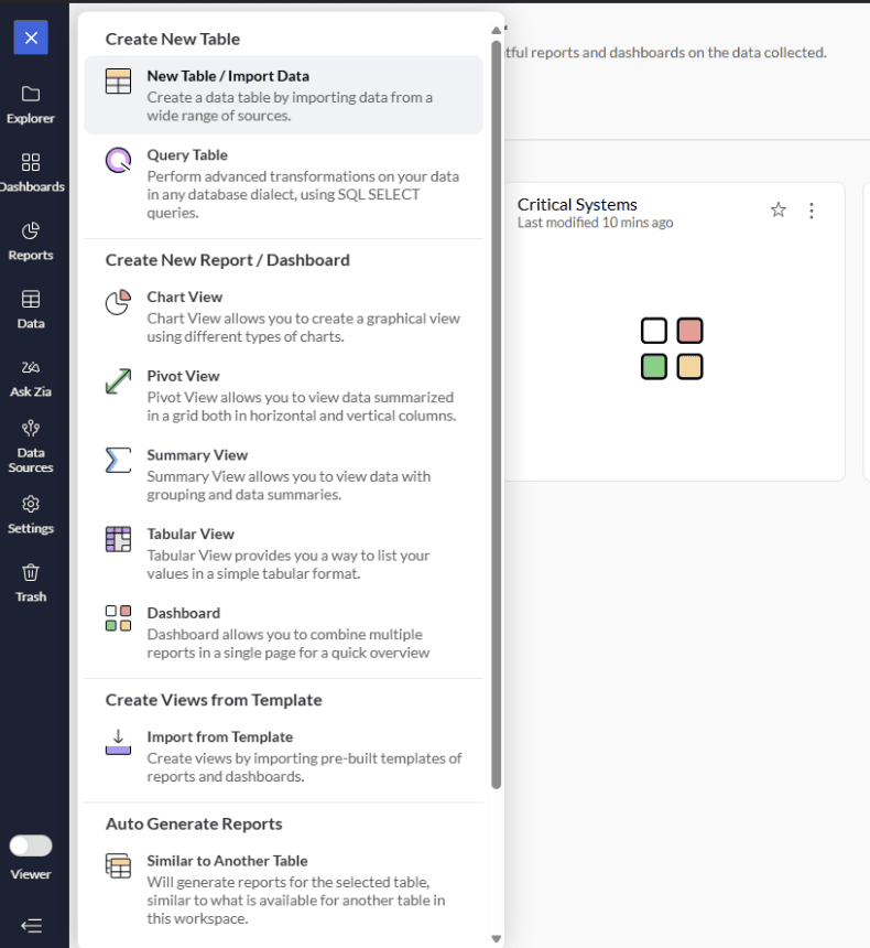 Yes. To do this, open the Vulnerability Manager Plus Analytics workspace, click Create from the side panel, and select the New Table / Import Data option. You can integrate with other applications or choose to import data stored in local files, web URLs, local databases, cloud databases, and cloud drives. Click the corresponding links to know more.