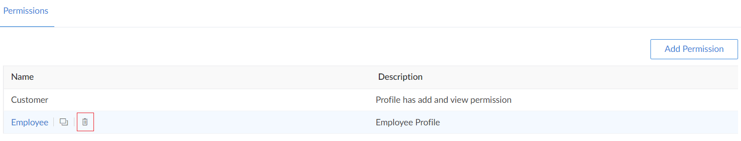 - Hover the mouse over the required permission. Click the Delete icon that appears.