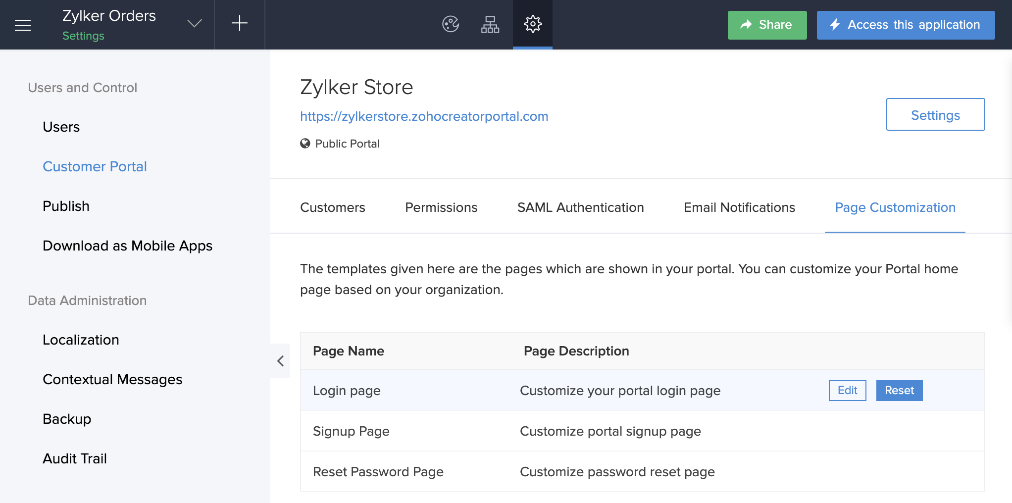4. Navigate to the Page Customization tab. Your customer portal's pages will be listed.