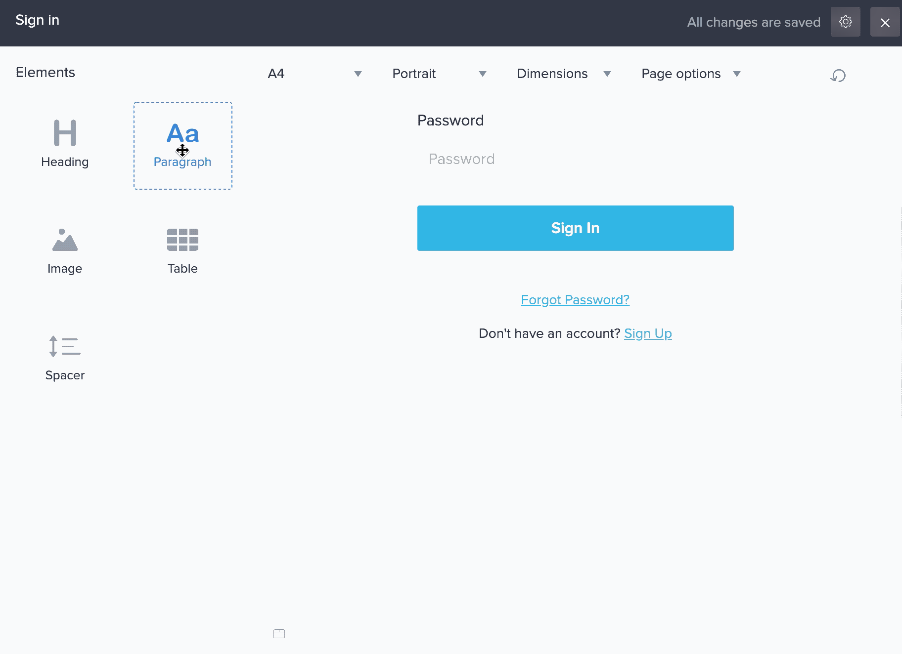 2. Drag and drop the required element onto the page. Alternatively, you can also double-click the required element. Its toolbar will appear at the top of the designer.