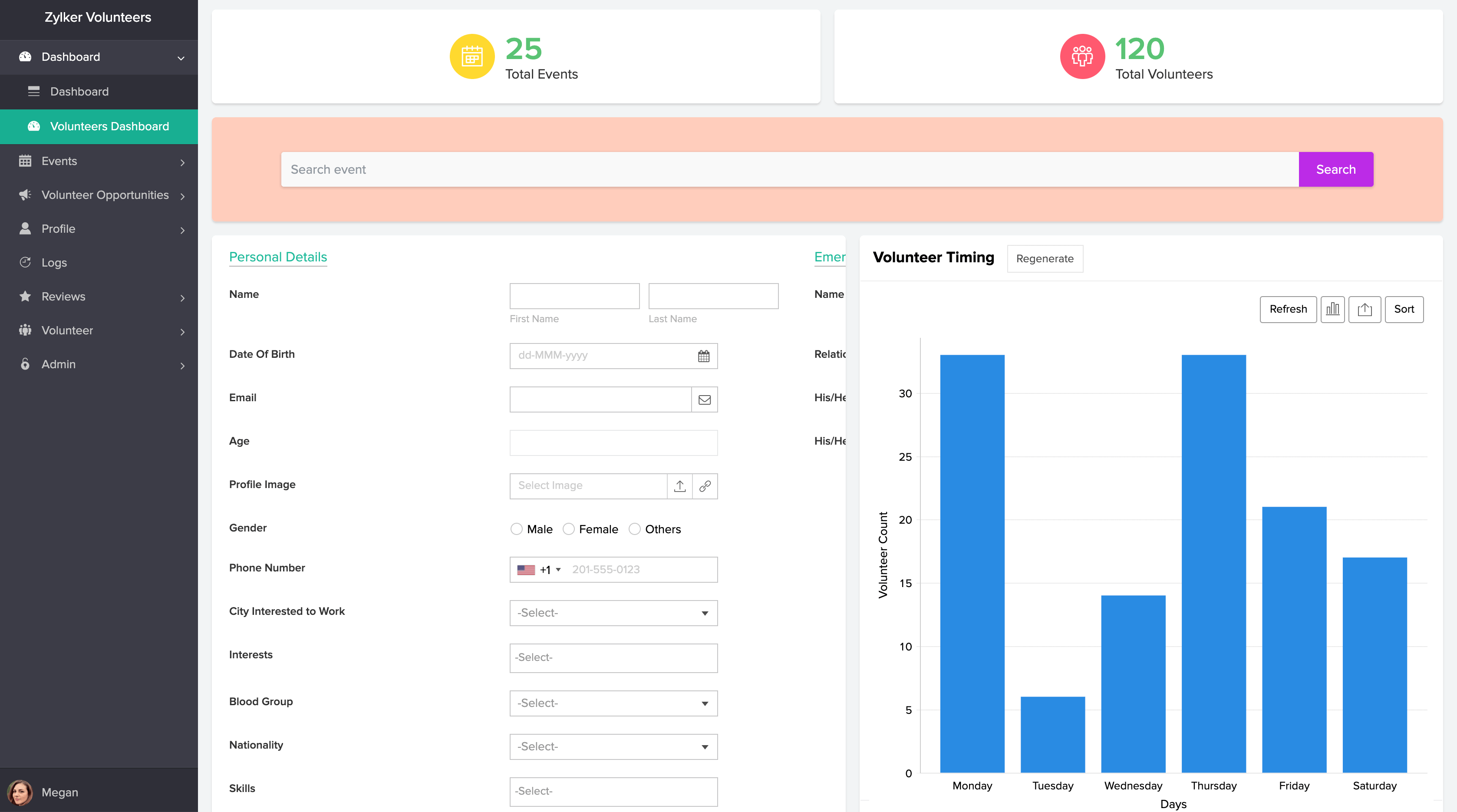 Below is an image of a published page with its published components — search element, Personal Details form, and Volunteer Timings report.