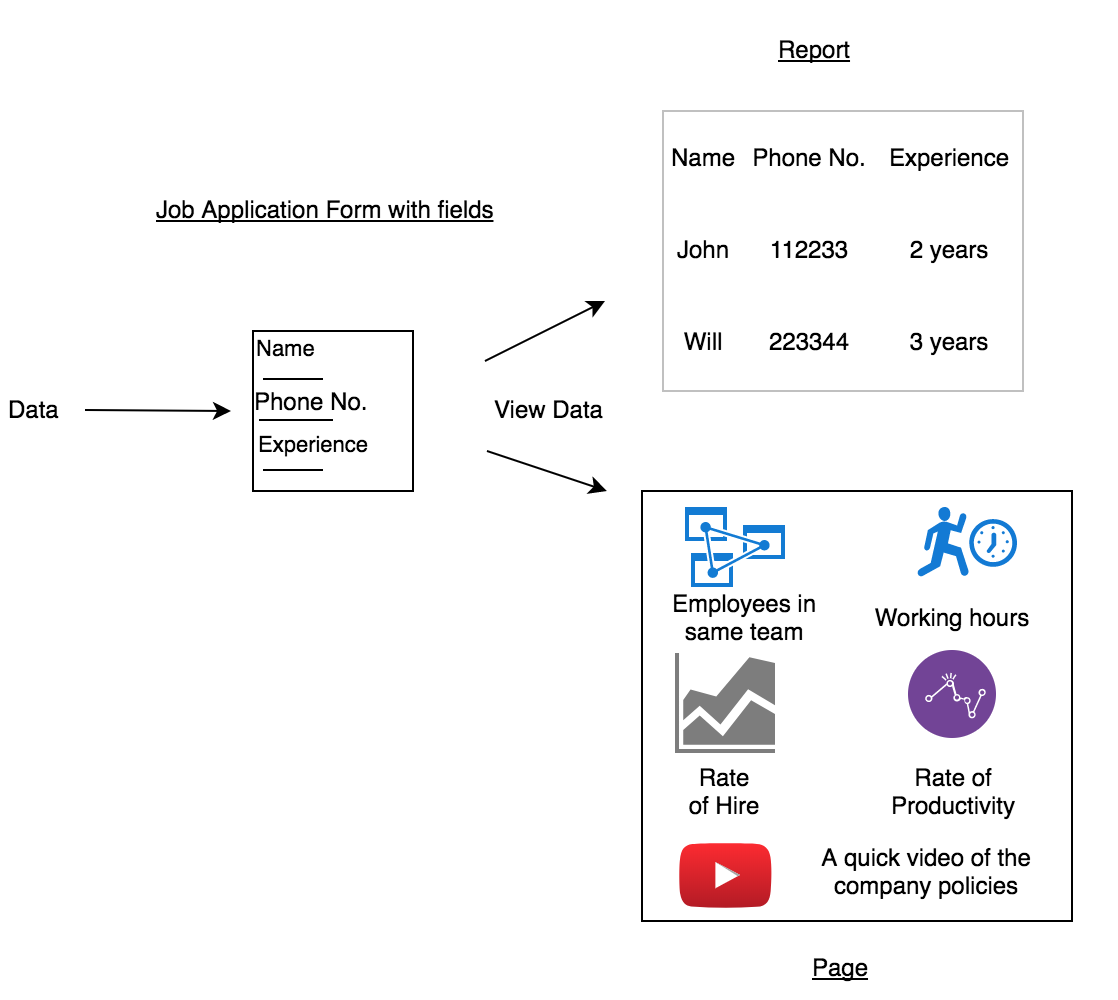 When you have collected enough data, you can use the Reports component to gain insights from it. However, there are various volatile aspects of your business that can impact its overall performance. It is much more convenient to collect and access all this data in one place, rather switch between multiple locations. Pages in ManageEngine AppCreator help you achieve this objective. Using pages, you can aggregate and extract values from the data collected, convert it into manageable chunks of visual information, and access a detailed overview of your business, all on a single screen.