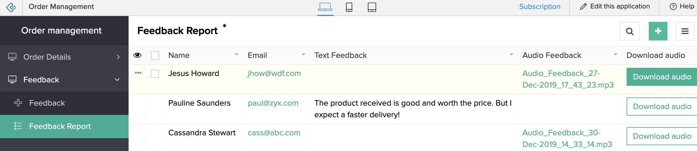 For example, imagine that you've built an Order management application. In this application, you have created a form named Feedback, where you collect feedback from your users via multi line and audio fields. You have given the choice of selection to your users to submit the feedback as text or record it as an audio. When you access the Feedback report, you may want to download the audio feedback files. To do this, you can configure a custom action such that when you click the button Download audio, the audio file is downloaded. This custom action has the above URL format constructed as follows:
