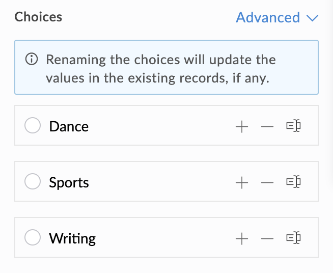 - On renaming the choices, the records with the existing values will be updated with the new choice values, wherever applicable. For instance, you have records with choice values as 'a', 'b', and 'c'. You rename 'a' to 'x'. Once this change is saved, wherever the value 'a' is found in the existing records, it will be replaced with the new value 'x'. But, the values 'b' and 'c' will remain unchanged.
