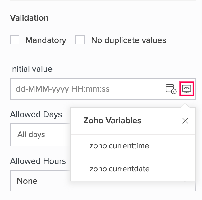 - Click the rightmost icon in the input box below Initial value, then select zoho.currenttime. This will ensure that the current date and time is set in this field when your users access your form.
