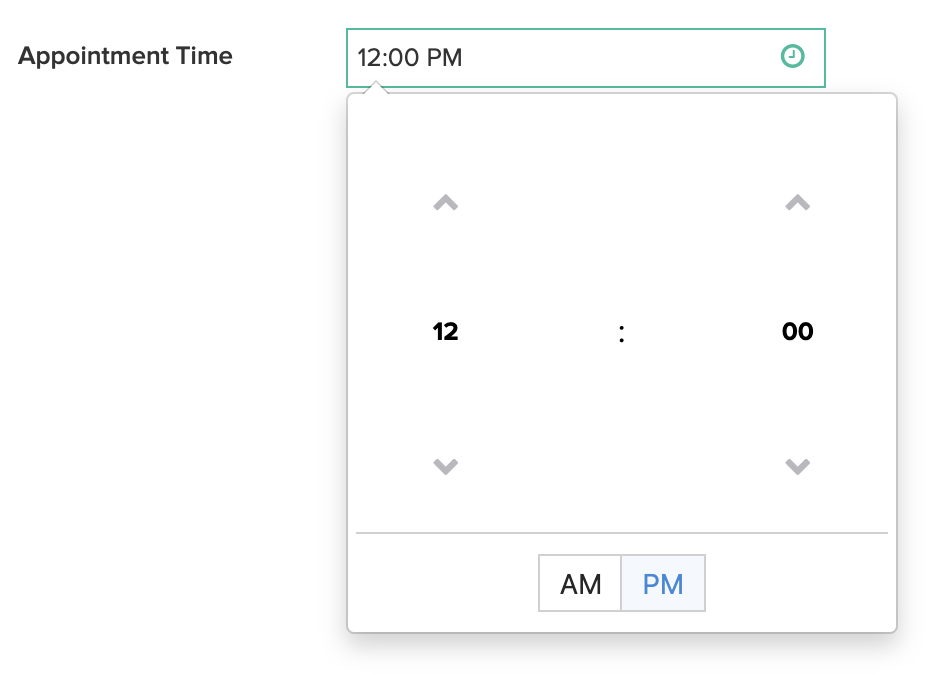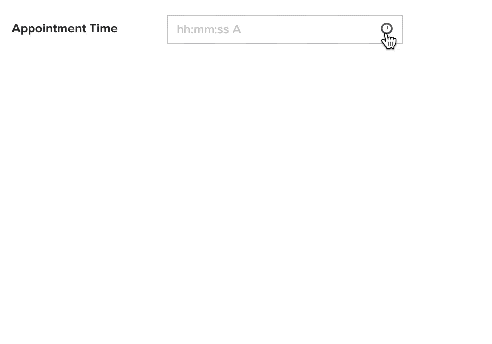 The time field enables your users to enter a valid time. They can either use a time picker or type the required time value. The time field displays time as per the time format and time zone set in your app's settings. Below is how a time field looks on a form: