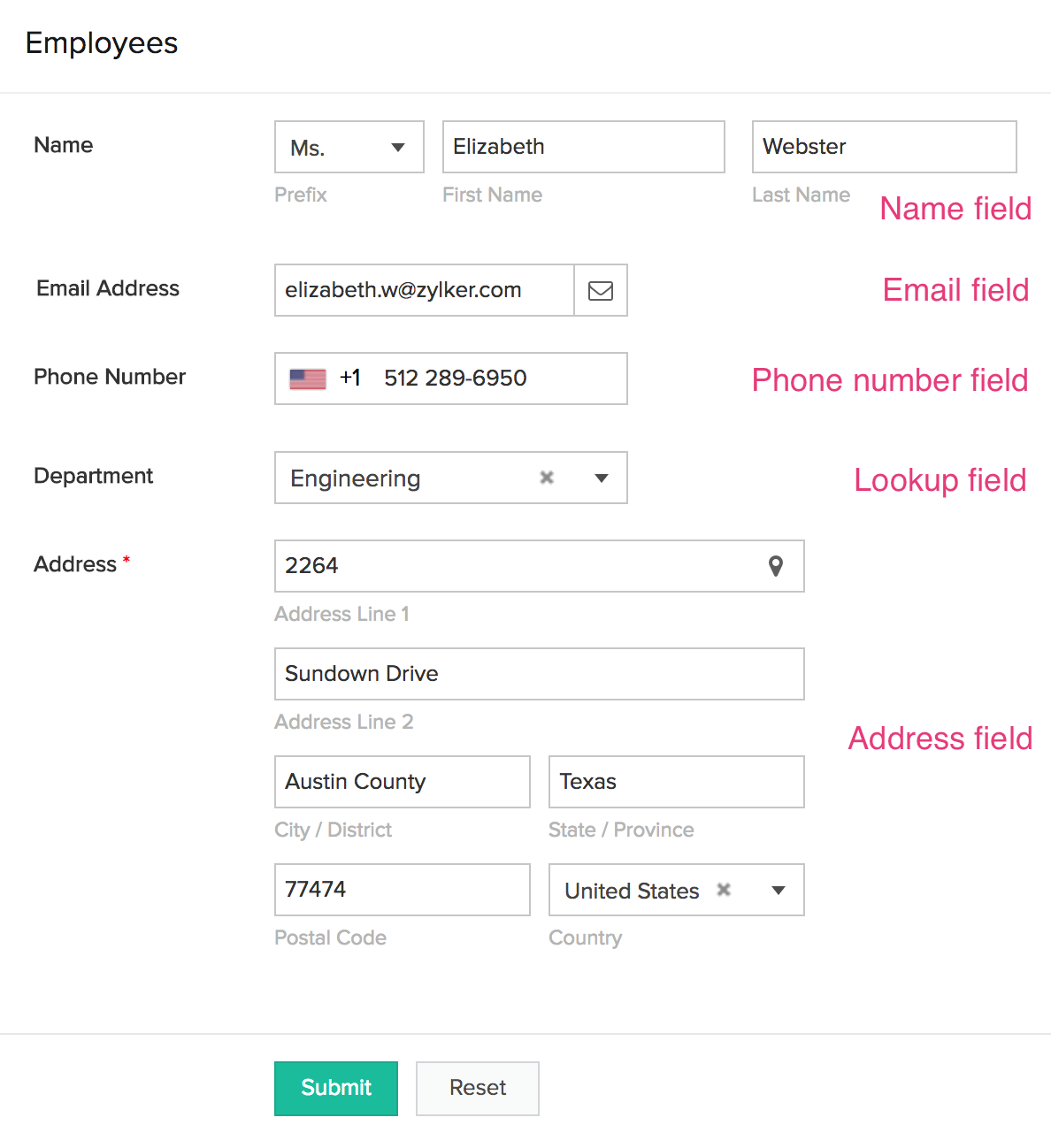 For example, a form to collect the contact details of your employees may contain separate fields to capture name, email address, phone number, residence address, etc. Each record stored in this form represents the contact information of an employee and each field in a record stores one piece of that information.