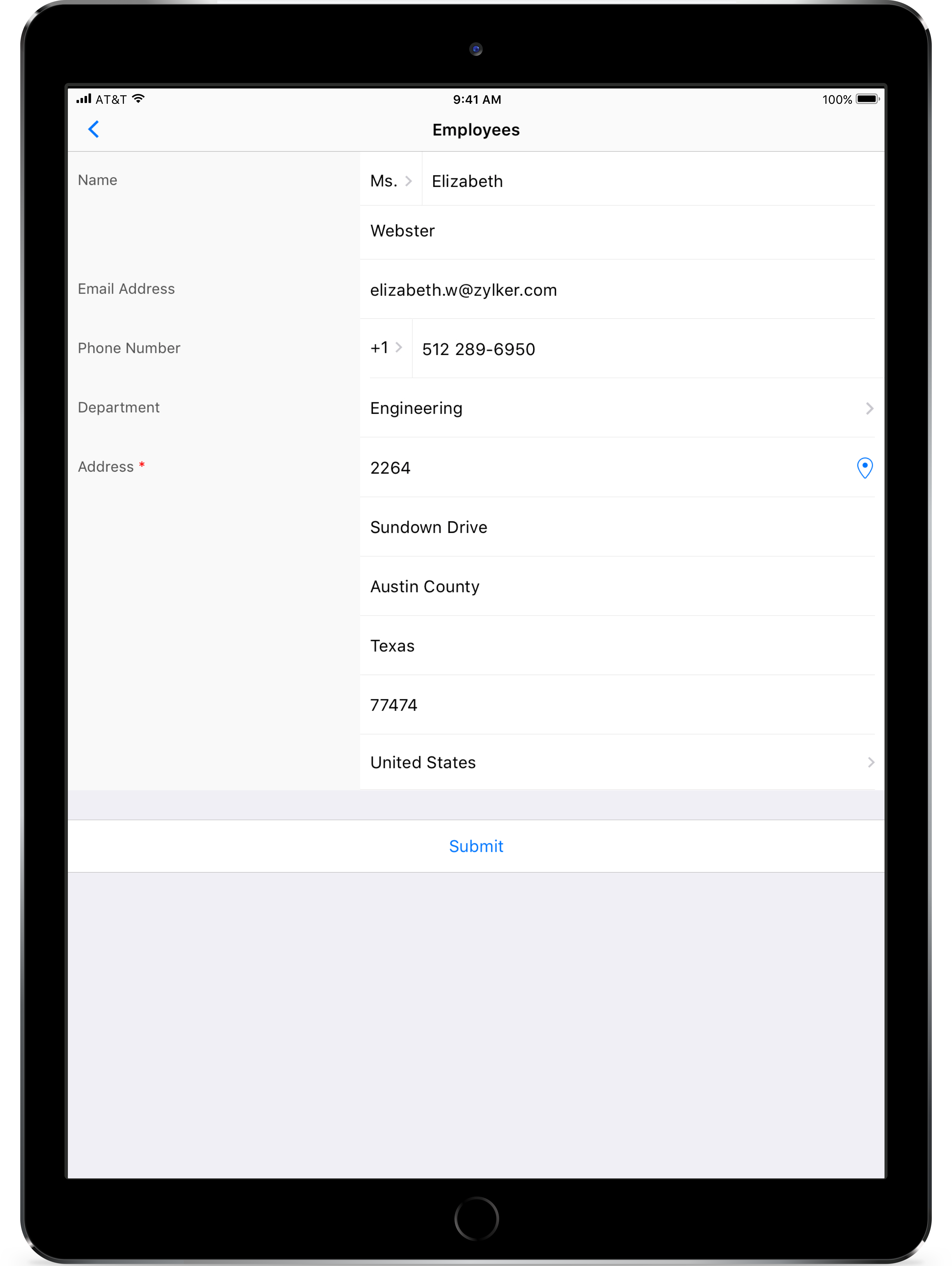 The following images show how an Employees form looks when a user accesses from a tablet: