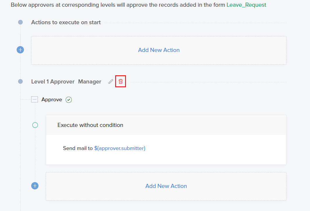 - Mouse over the header of an approval block and click the Delete icon. The approver along with the associated actions will be deleted from the workflow.