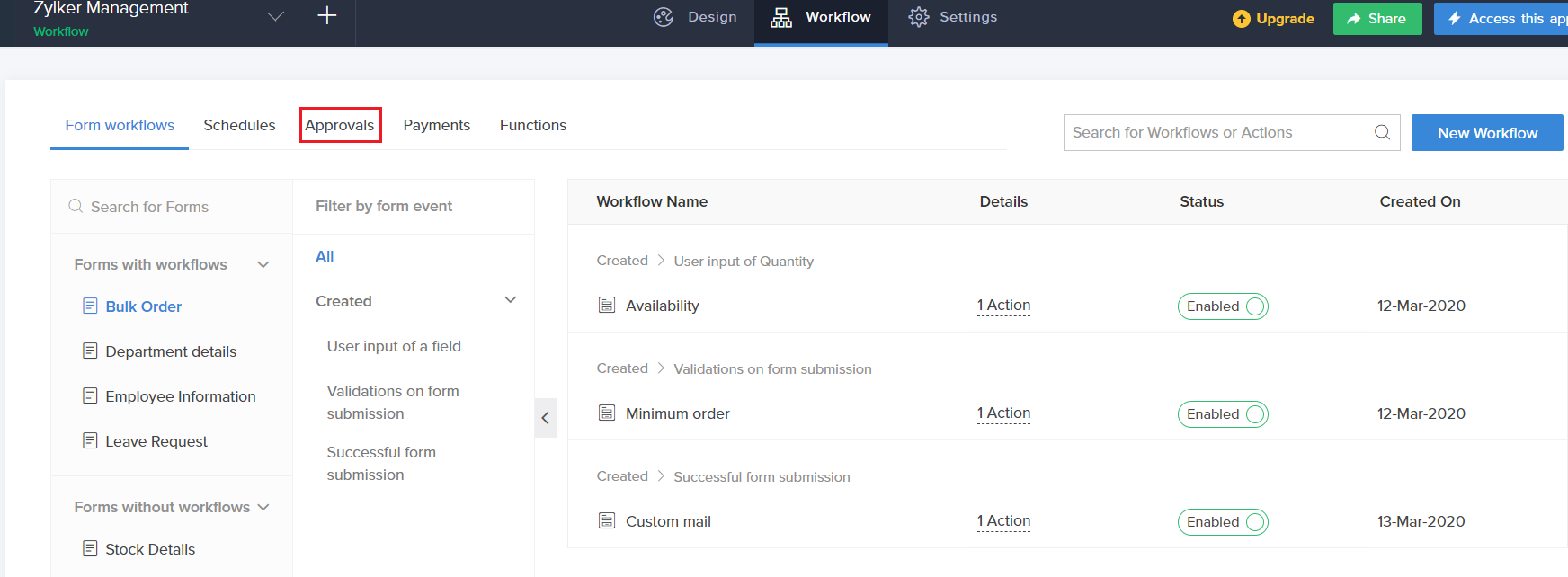 - Navigate to the Approvals tab on the Workflows page. The page will list all the preconfigured approval workflows.