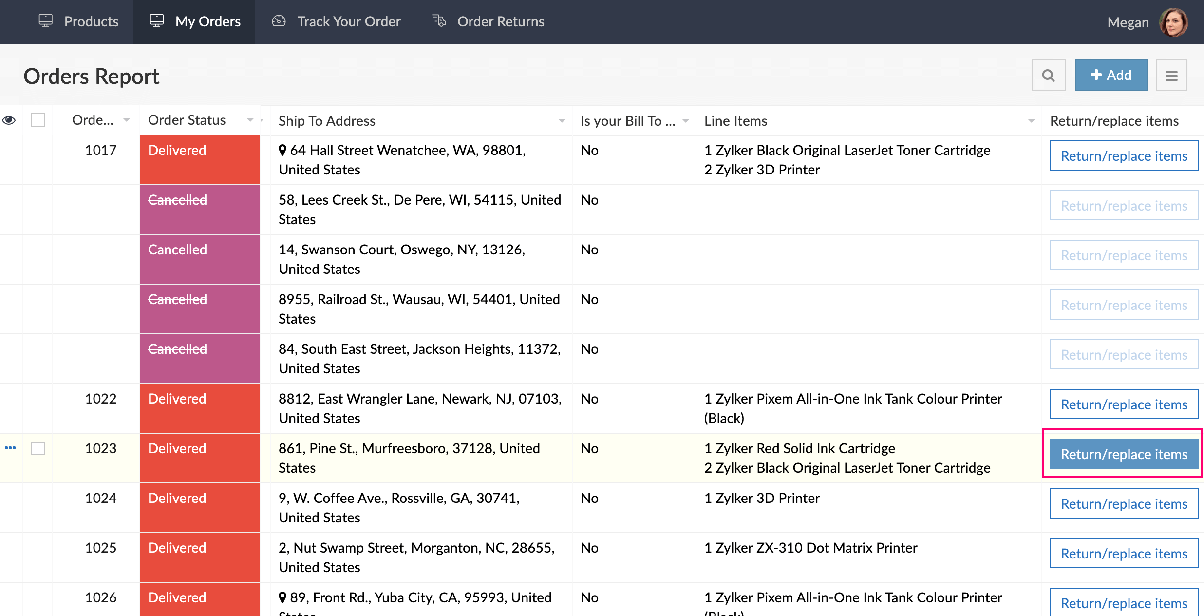 Imagine you've created an application called Order Management. In this application, you have designed a Dashboard page, where you have embedded the Orders report. You have also created an Order Return form, where users enter their order details and their reason for returning/replacing purchased items. The Orders report has a button (action item) named Return/replace items.