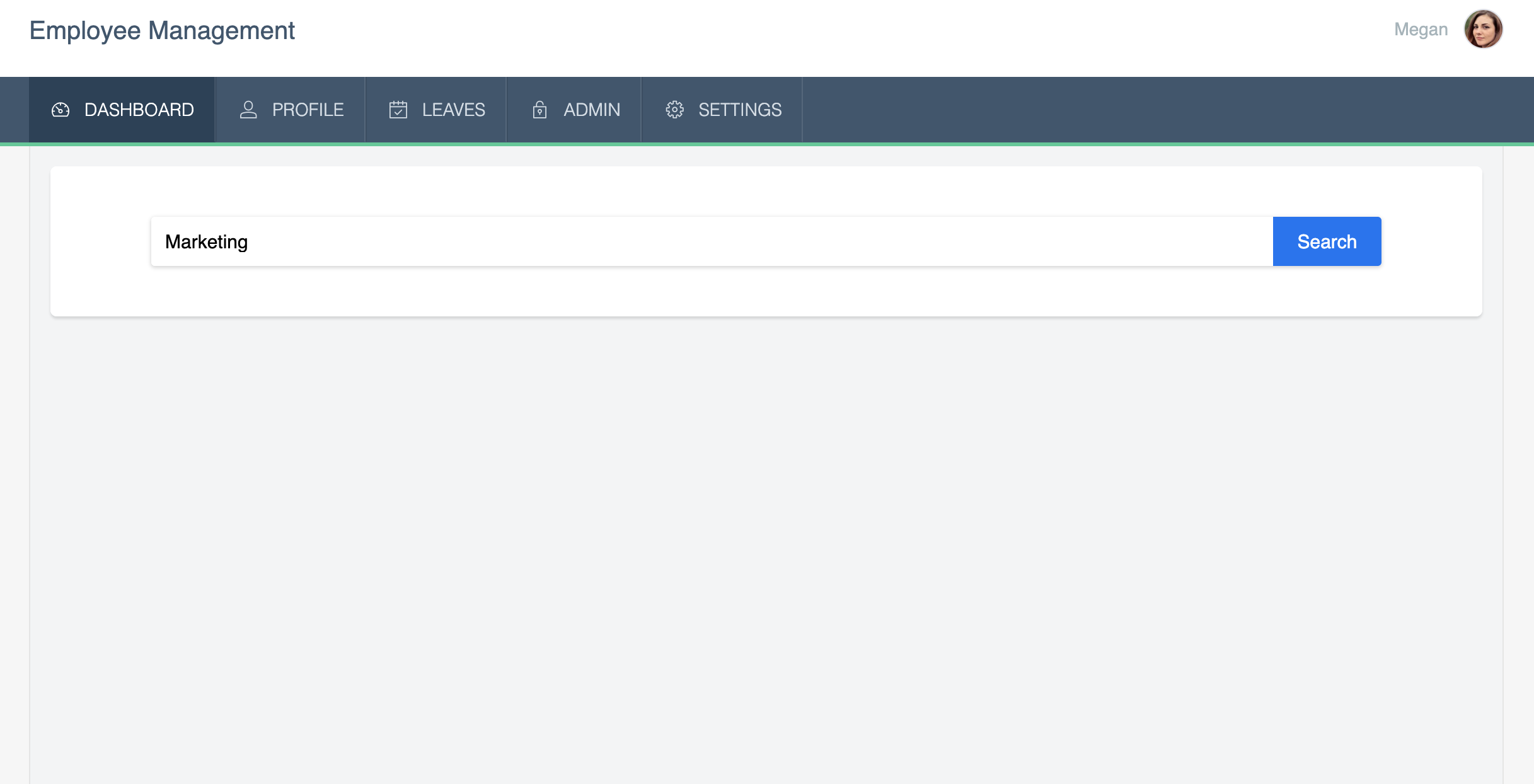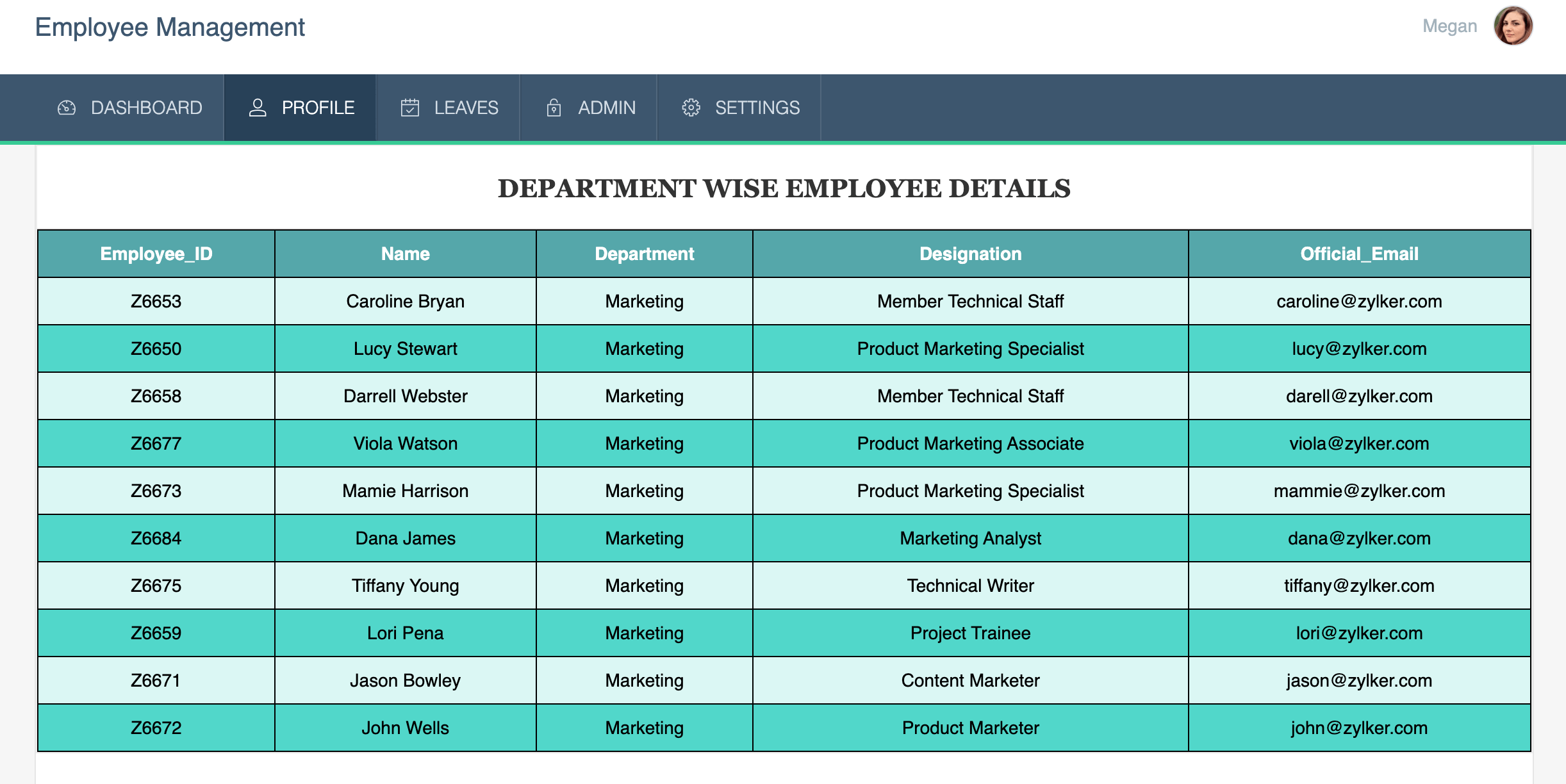 - The target page called Employee Profiles, in which the search results are shown in the form of a table (HTML snippet) that filters and displays employee details based on the chosen department.