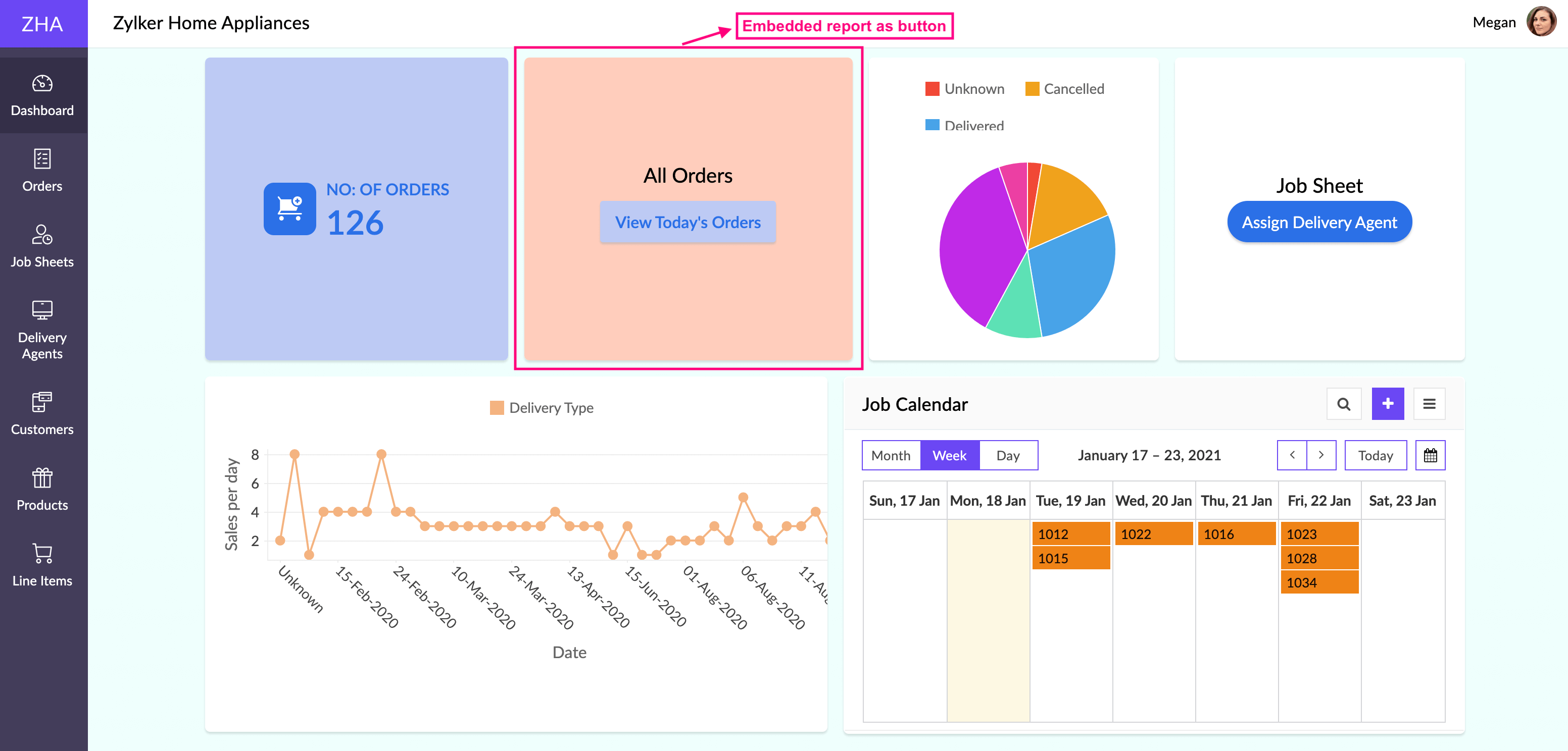 A report can also be embedded into your page in a button format. Clicking this button directs you to the report (from any of the applications in your account) in a custom target location like pop-up, same window or a new window. You can customize various aspects of the button. Learn how