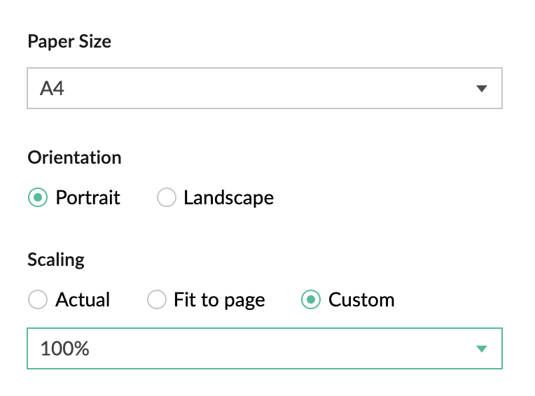 - If the Custom option is chosen, you must select the required scaling value (%). This option helps to zoom out the entire report and print all the columns with proper readable width onto the selected paper size.