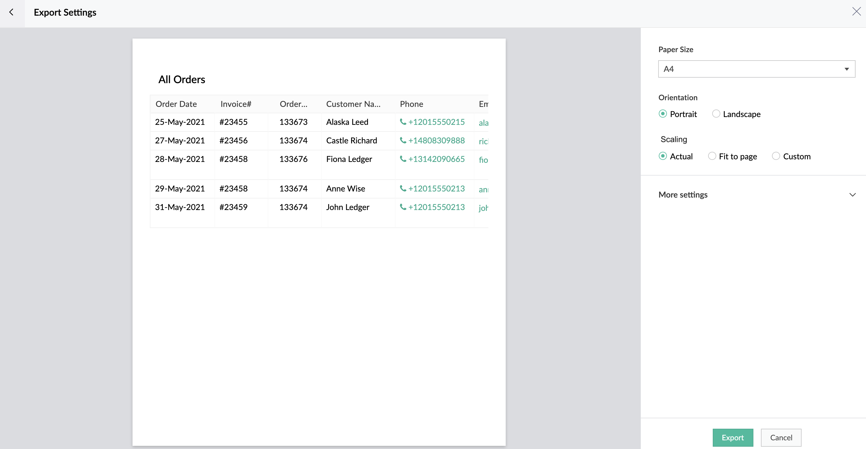 - Actual width - This option will print the columns/field-value pairs with their actual width in live mode onto the selected paper size. There might be instances where some columns might be cut off after export.