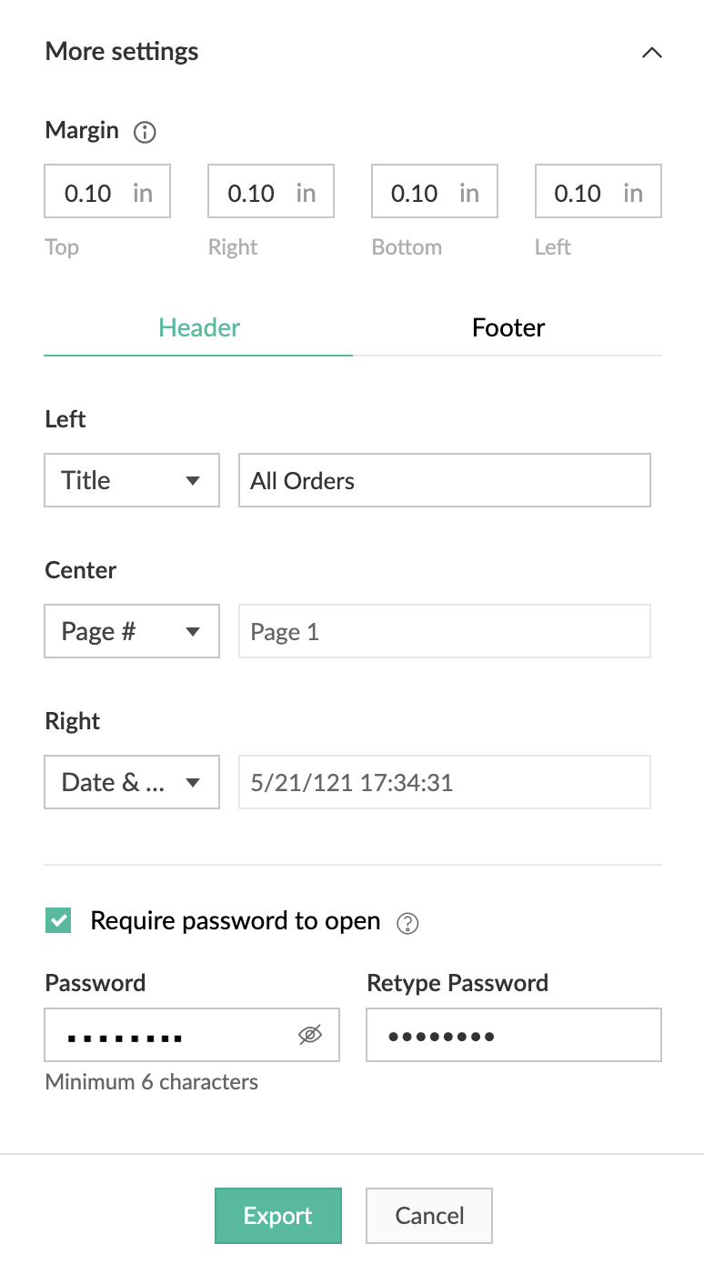 - Header: Specify the fields (report name, date and time, and page number) to be displayed in the left, center, and right sides of your PDF file in the header. The report name can be customized to suit your requirements.