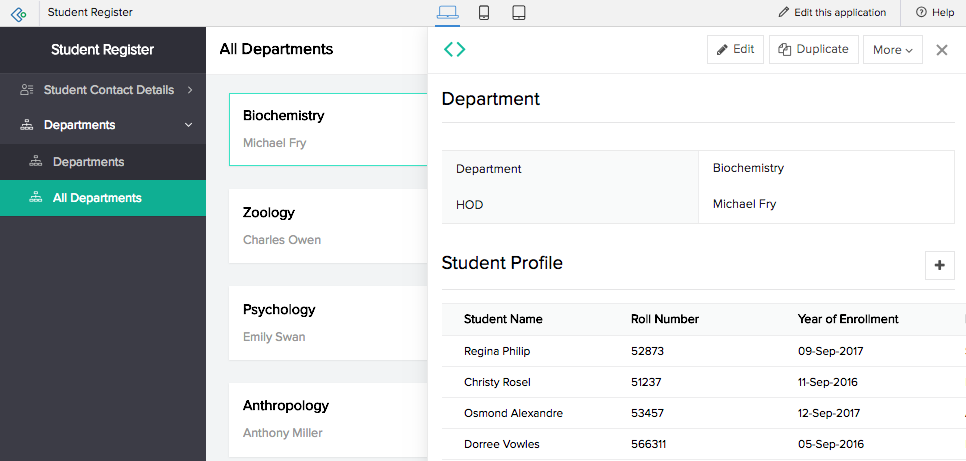 - Block layout - The layout enables you to organize the fields and their values as blocks and also allows you to incorporate other relevant field information into the detail view of that particular record. Thus on clicking a record, its details and data from related form fields are displayed as structured chunks of information. For instance, if you have an Student Register application, and you have a report with department details. On click of a record, the detail view displays the information related to that department. In this layout, you could incorporate records that directly or indirectly have a relationship to it. In this case, an additional block could include the records of those who are in the a particular department. In a sense, you are infusing a report into a record and this help weave correlating data into one screen.