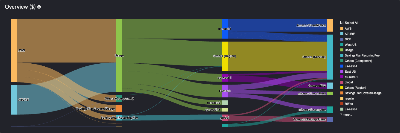The Overview section displays a detailed breakdown of cloud costs in a chart form for entities such as region, services, and other components.