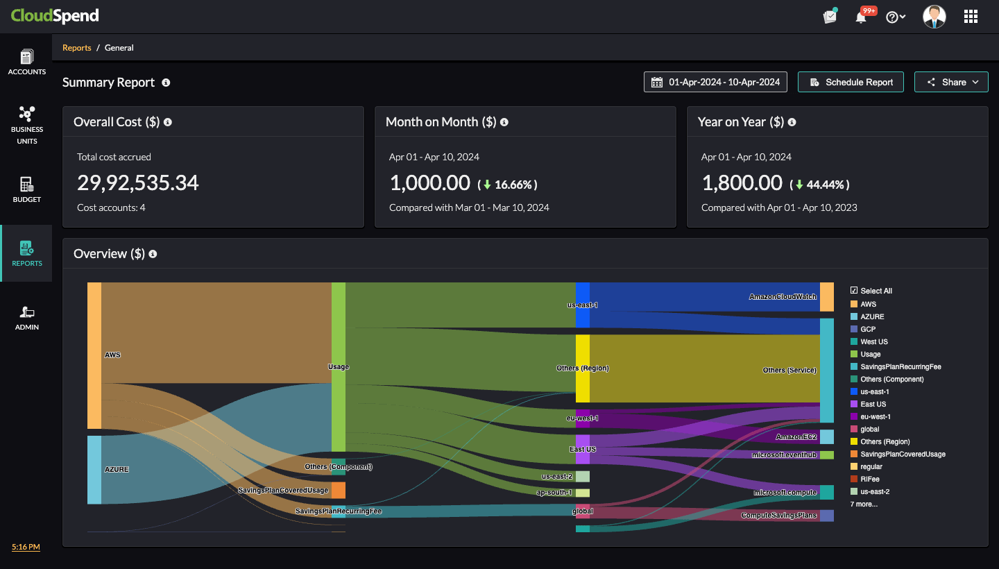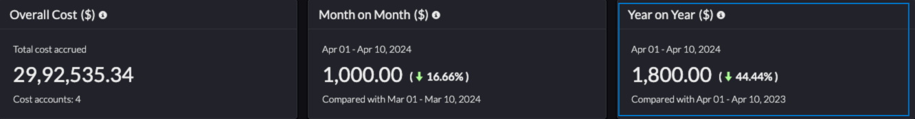 Therefore, your Year on Year cloud cost percentage difference in April 1-10, 2024 when compared to April 1-10, 2023 is 44.4%. That is, you have saved 44.4% of your cloud bill.
