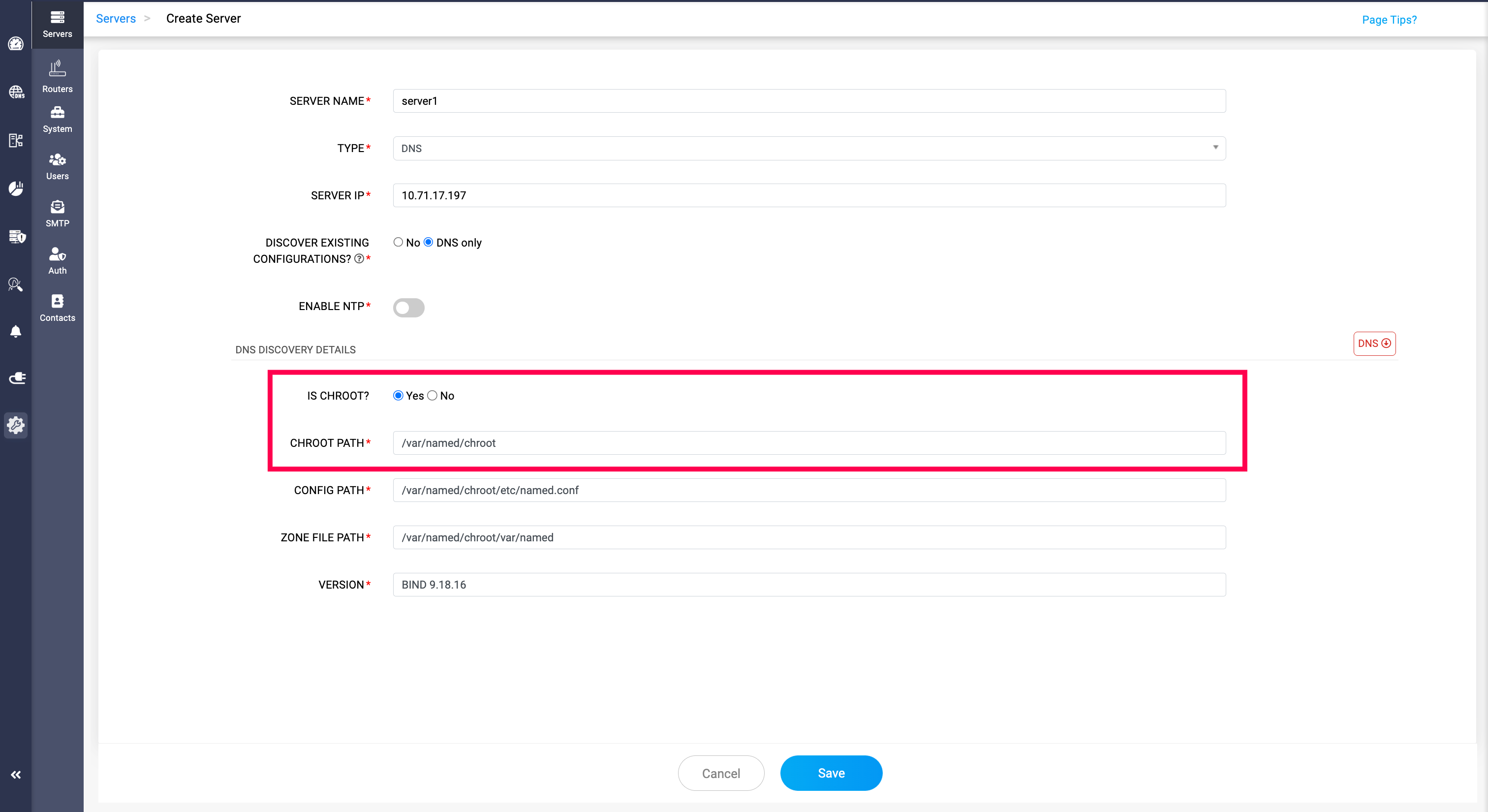 Once DDI Central has successfully discovered and imported the DNS server, you tighten security and let BIND run as a dedicated, limited user (ddi).