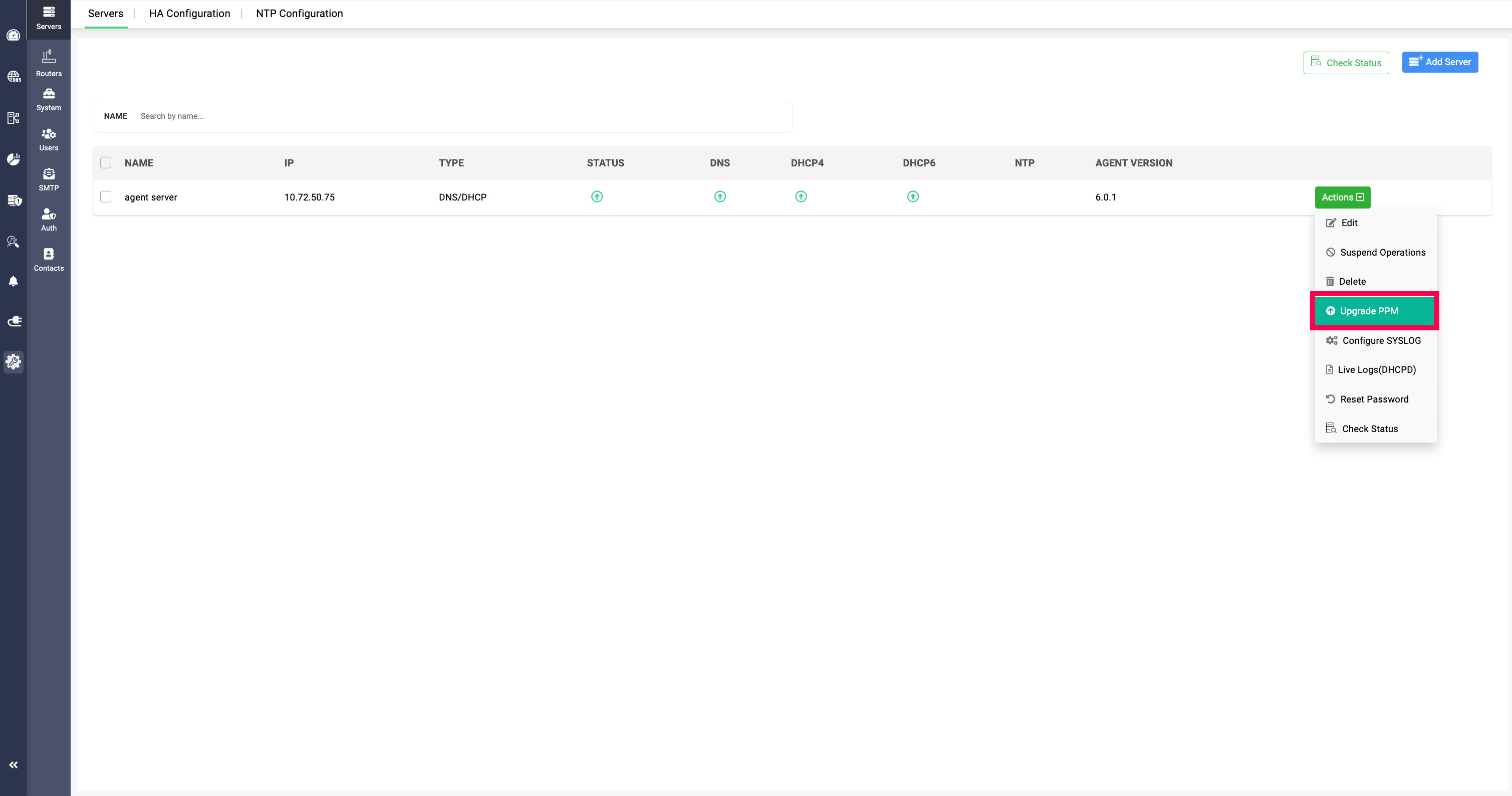 Action 3 -> Suspend Operations: Both DNS and DHCP servers within a cluster can be suspended from providing further updates to the app console UI, by going to Servers>Actions, and clicking on Suspend option in the dropdown menu.
