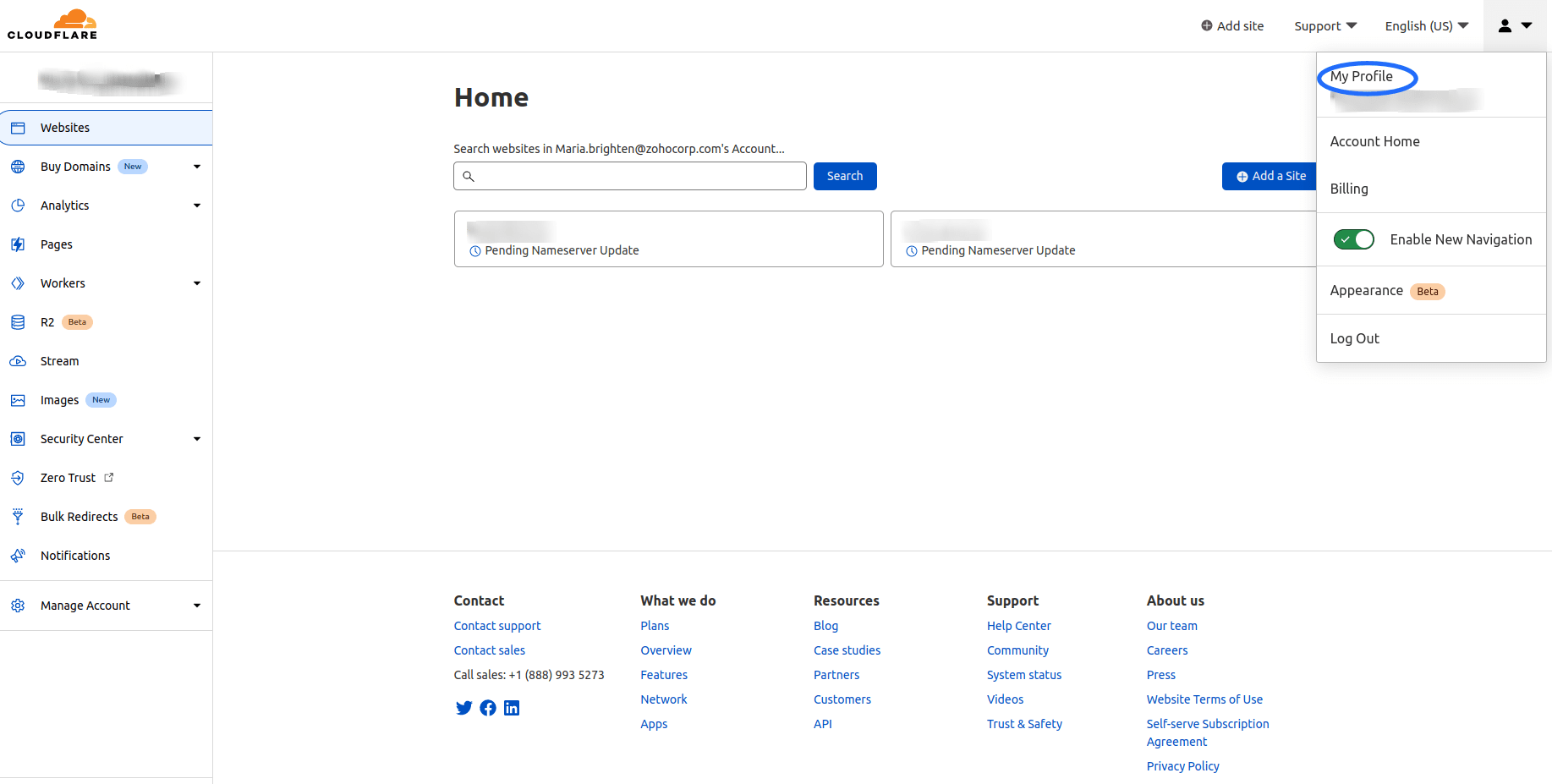 1. Login into your Cloudflare account. On the dashboard, click on the User icon and select My Profile.