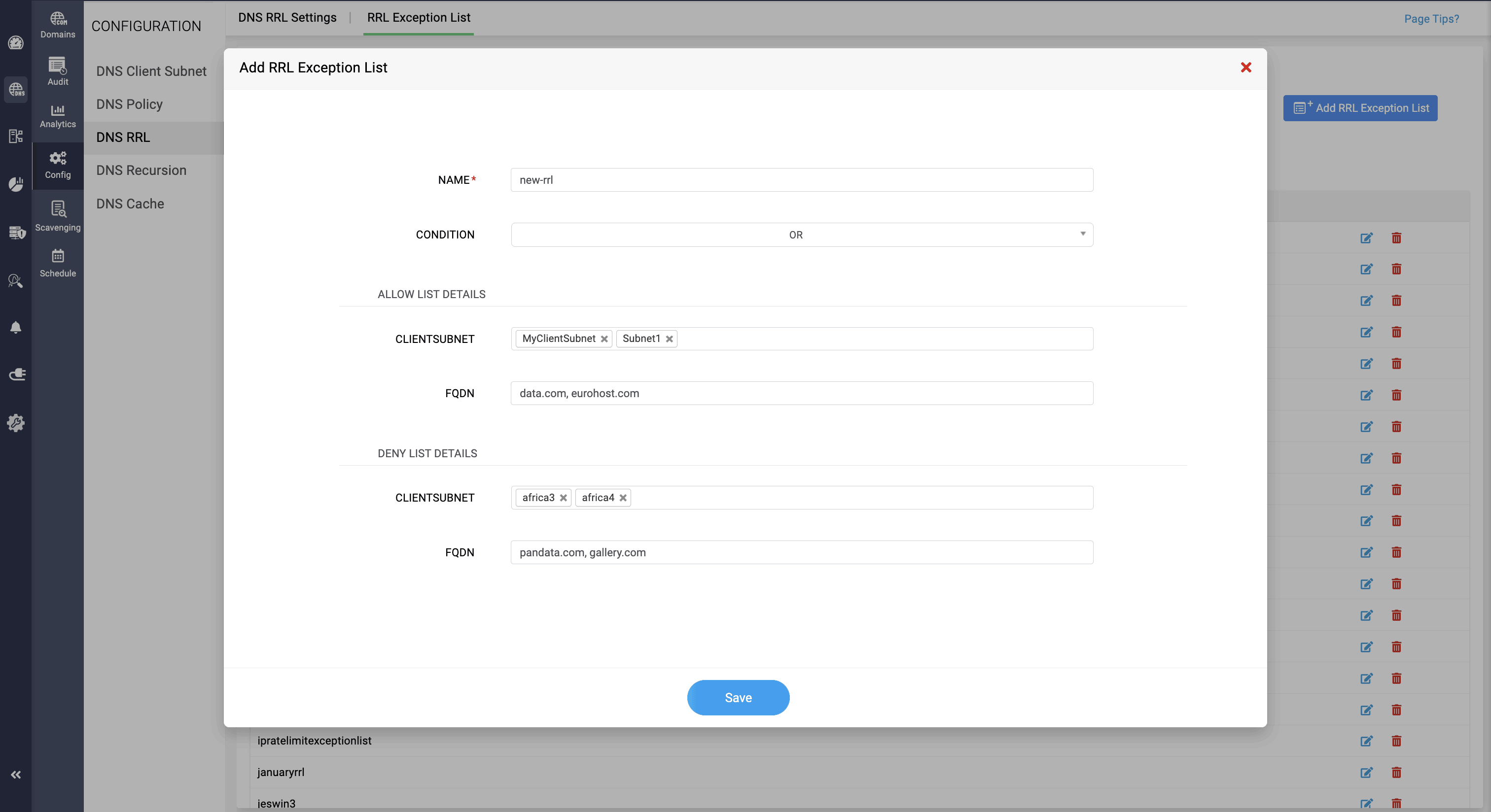 The image below illustrates how an RRL exception list is configured for Microsoft DNS using DDI Central.