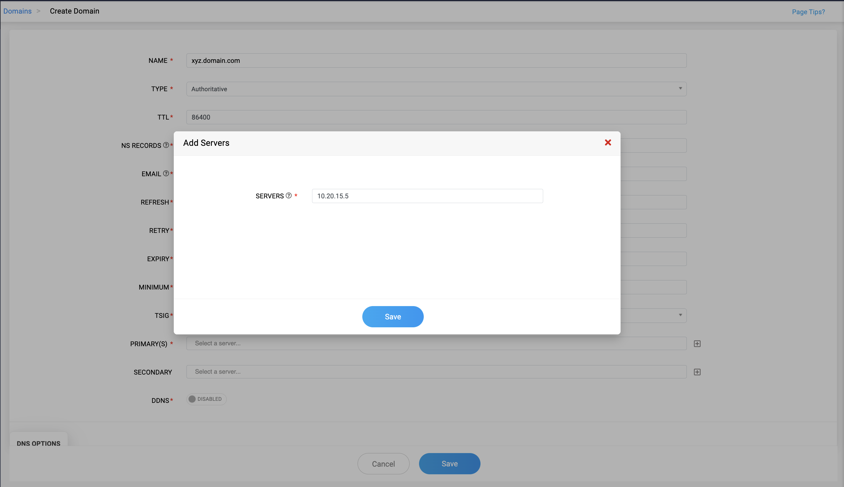 Note: It has become common practice for users to enter a nameserver that bears the same name as the domain under which it is configured. DDI Central now requires users to establish an appropriate A or AAAA record that can provide an authoritative answer for the nameserver before allowing it to be used with the domain name. For example, when configuring the domain 'clouddns.com' with a nameserver such as 'ns1.clouddns.com', DDI Central prompts you to first create an authoritative address record, either A or AAAA, for 'ns1.clouddns.com' within the domain.