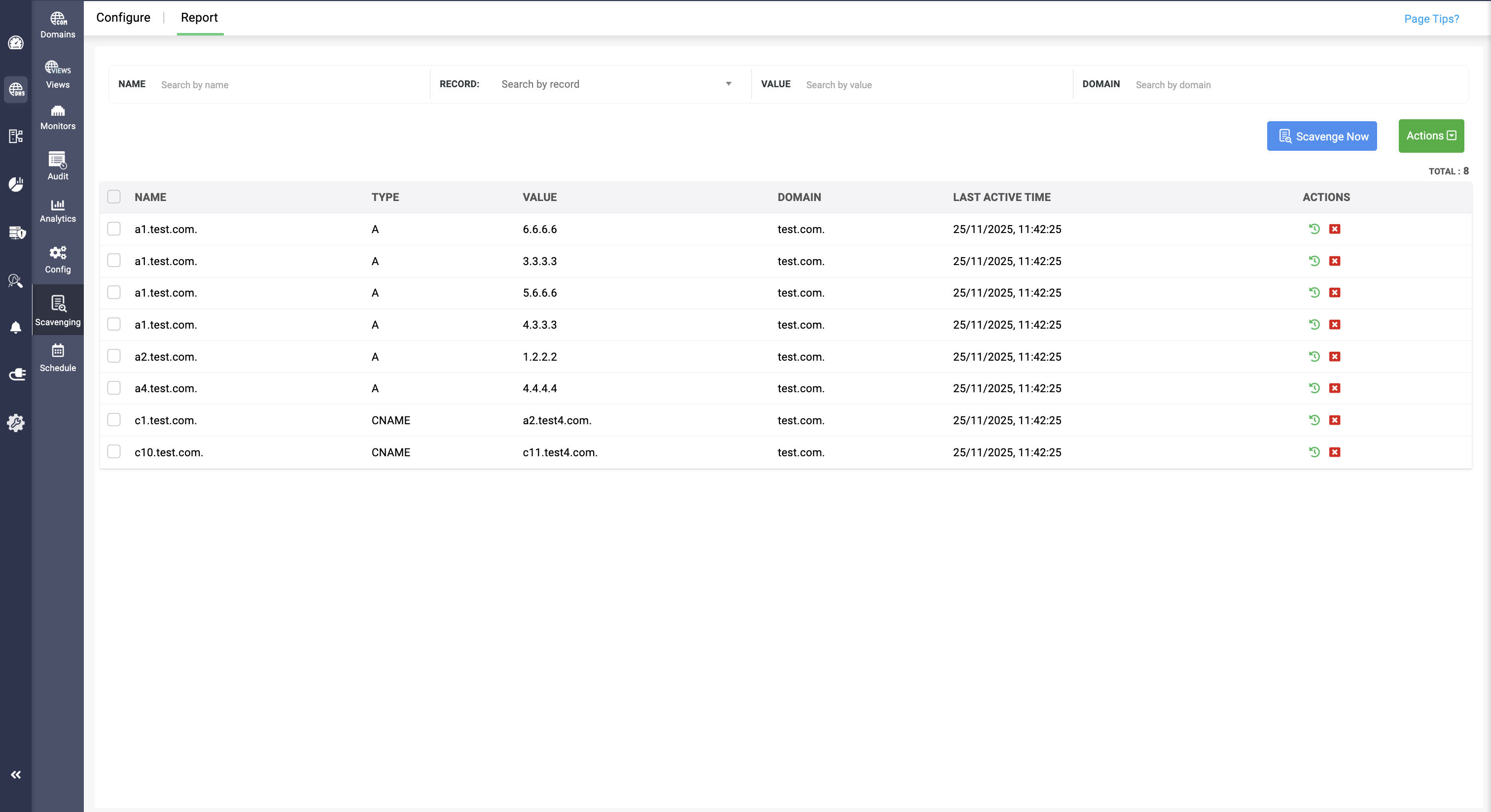 - On the Configure window that appears, the top field SCAVENGING PERIOD is meant for all the A, AAAA. CNAME, PTR of the domains selected. This is the duration after which a DNS record becomes eligible for scavenging if it has not been refreshed. If the DNS record still remains un refreshed after this period, DNS server considers the record stale and eligible for deletion and put up in the report for the user to delete or reclaim it .