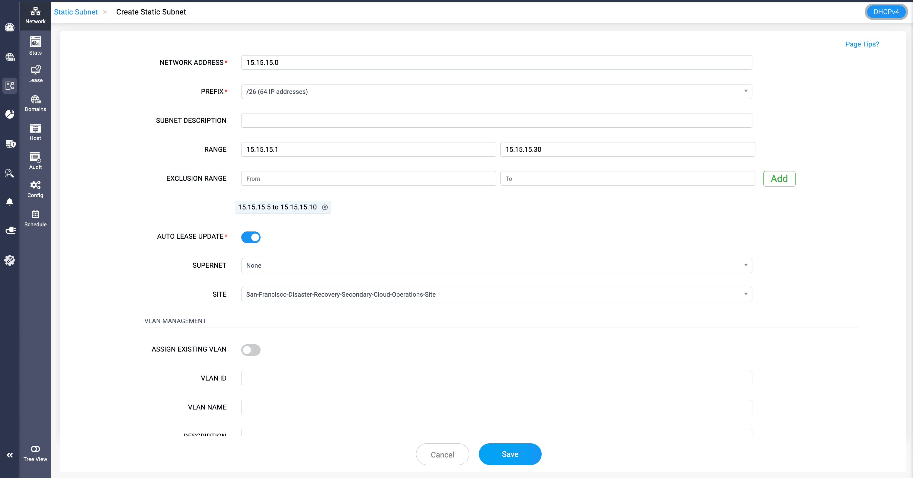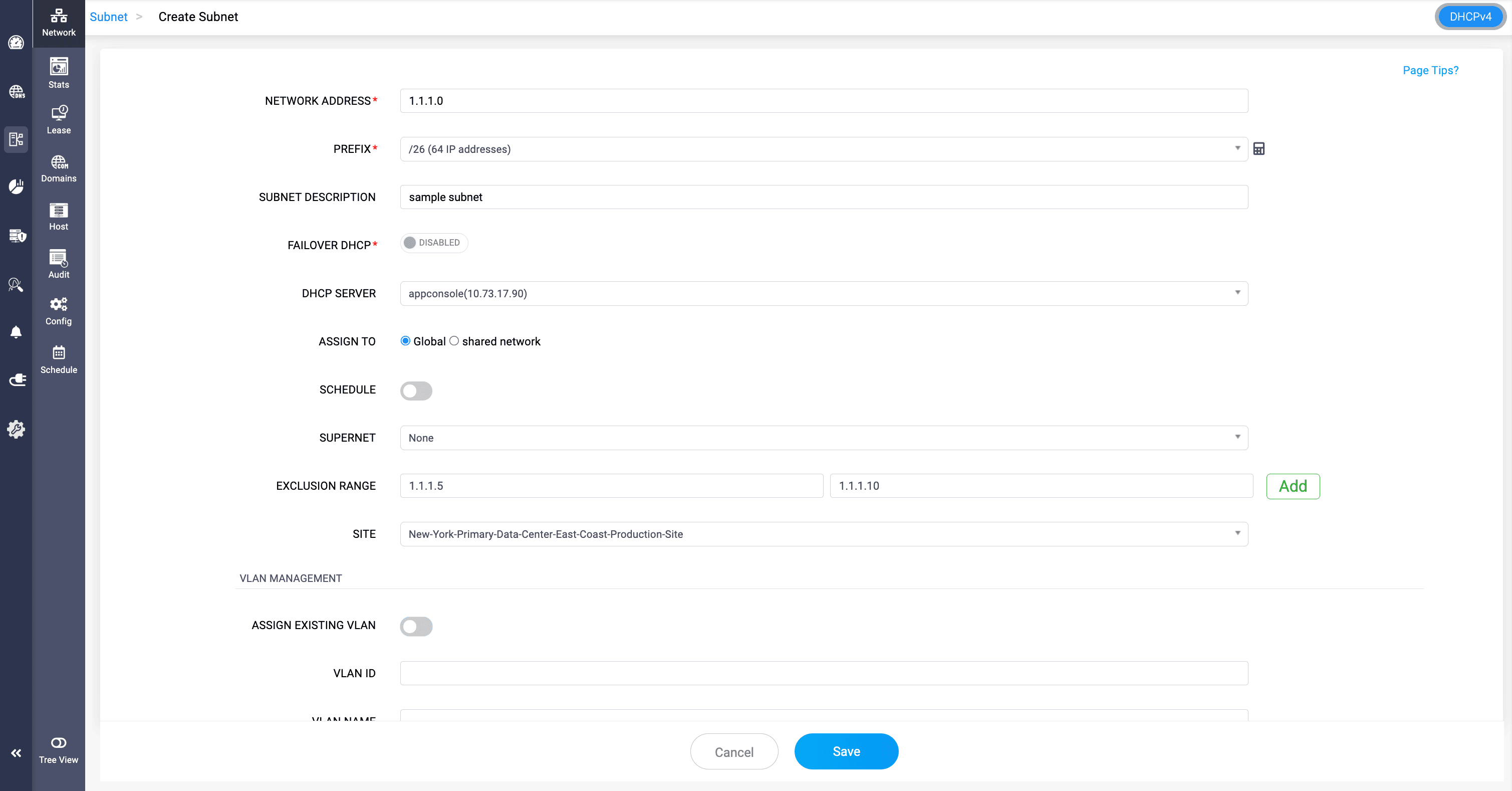 Schedule: Enable to schedule when this subnet will become active. Useful for timed deployments.Exclusion Range: Define a block of IPs within the subnet that should not be used for DHCP assignment. Prevents conflicts with statically assigned IPs. The field appears only if a valid Prefix range is defined for the subnet.