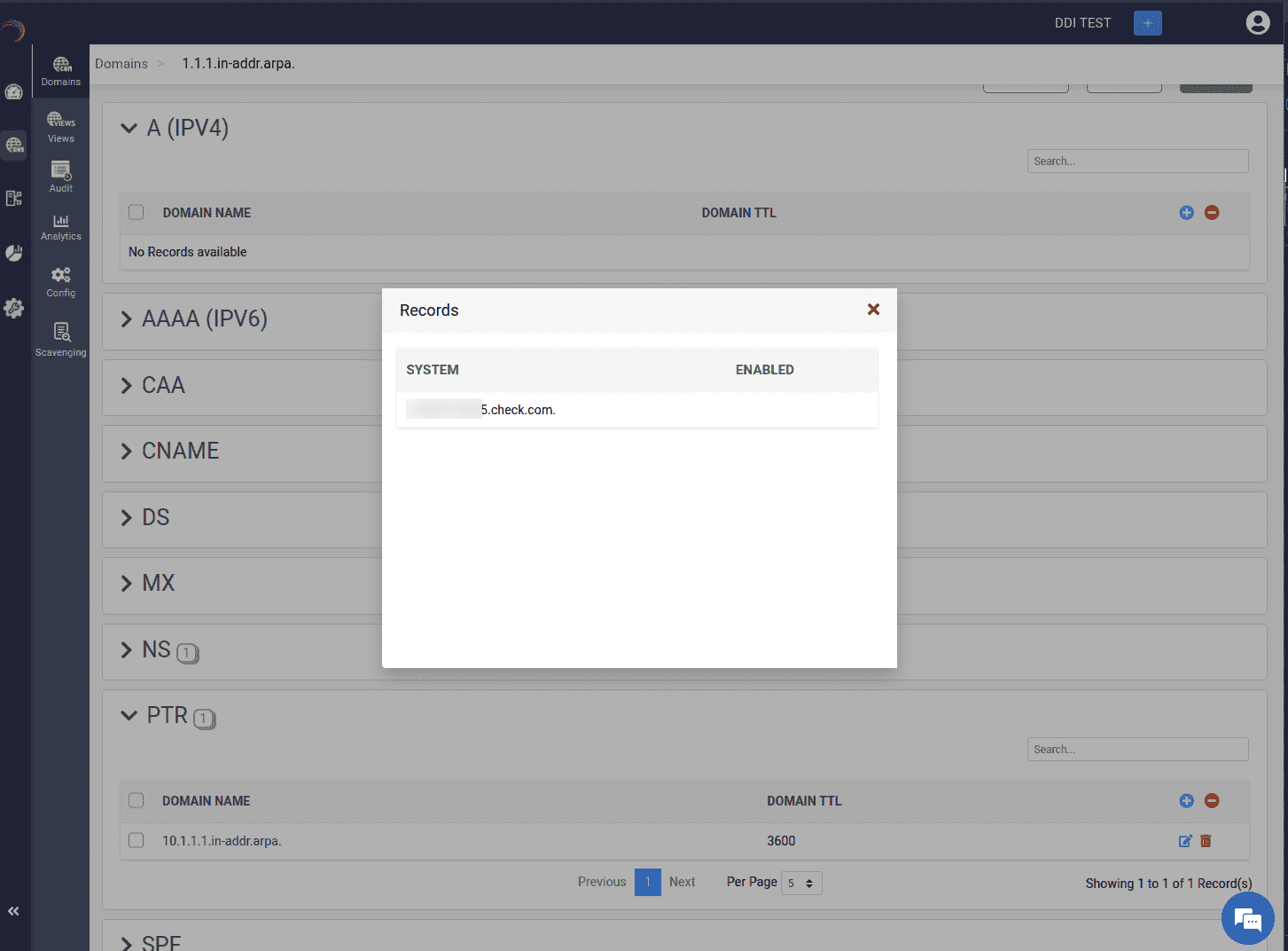 Example: In the provided example, 1.1.1.in-addr.arpa. is an IPv4-based reverse zone. Upon enabling DDNS, the DNS server will automatically generate a PTR record within this reverse zone. These PTR records will correspond to the hostnames defined in the authoritative A records of the forward-mapping zone.