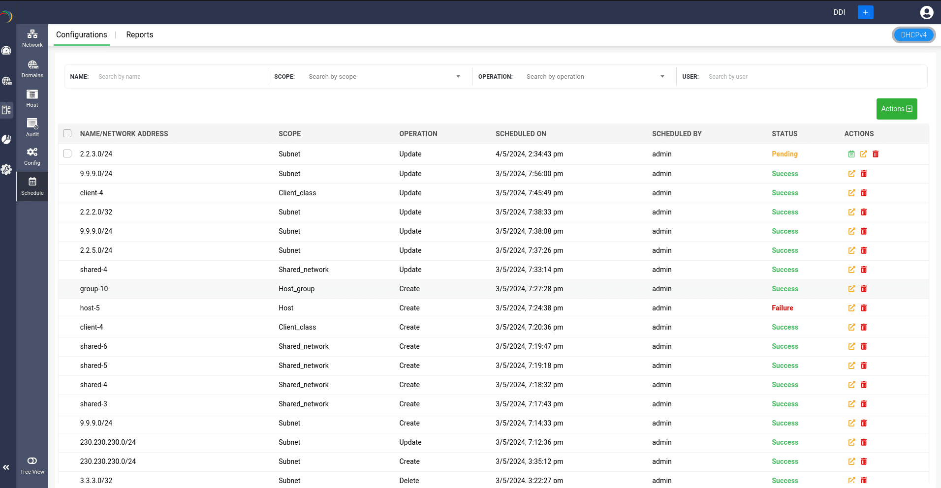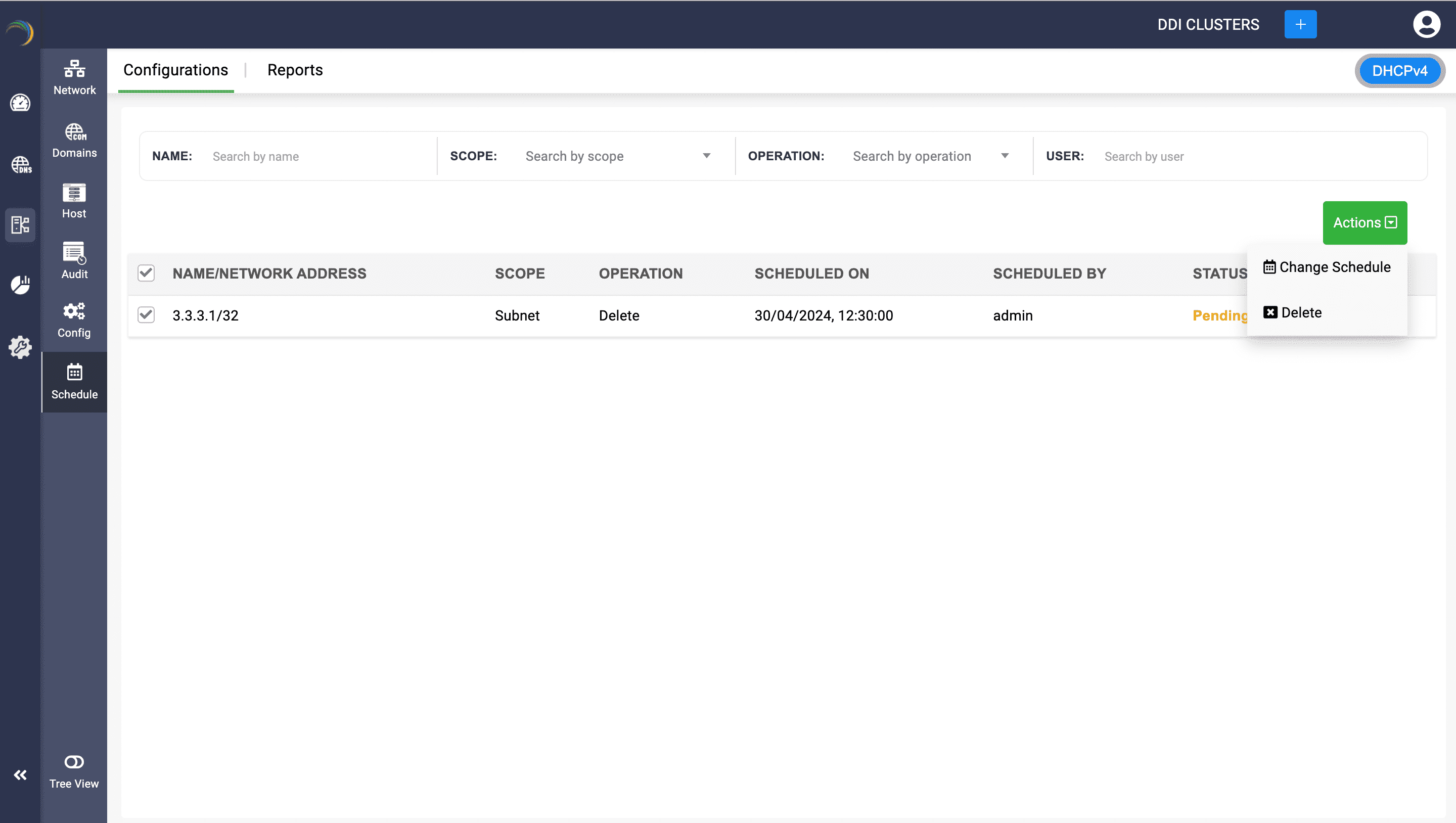 The Configurations tab provides a comprehensive overview of all scheduled scopes. Here, you can apply filters to search for specific configurations planned for your network. This tab exclusively allows you to reschedule, view, or delete these scheduled configurations. Additionally, you can select multiple configurations simultaneously and utilize the Actions dropdown button. From this dropdown, choose Change Schedule to collectively reschedule all the DHCP objects to one particular date and time, or select Delete to collectively remove the configurations.