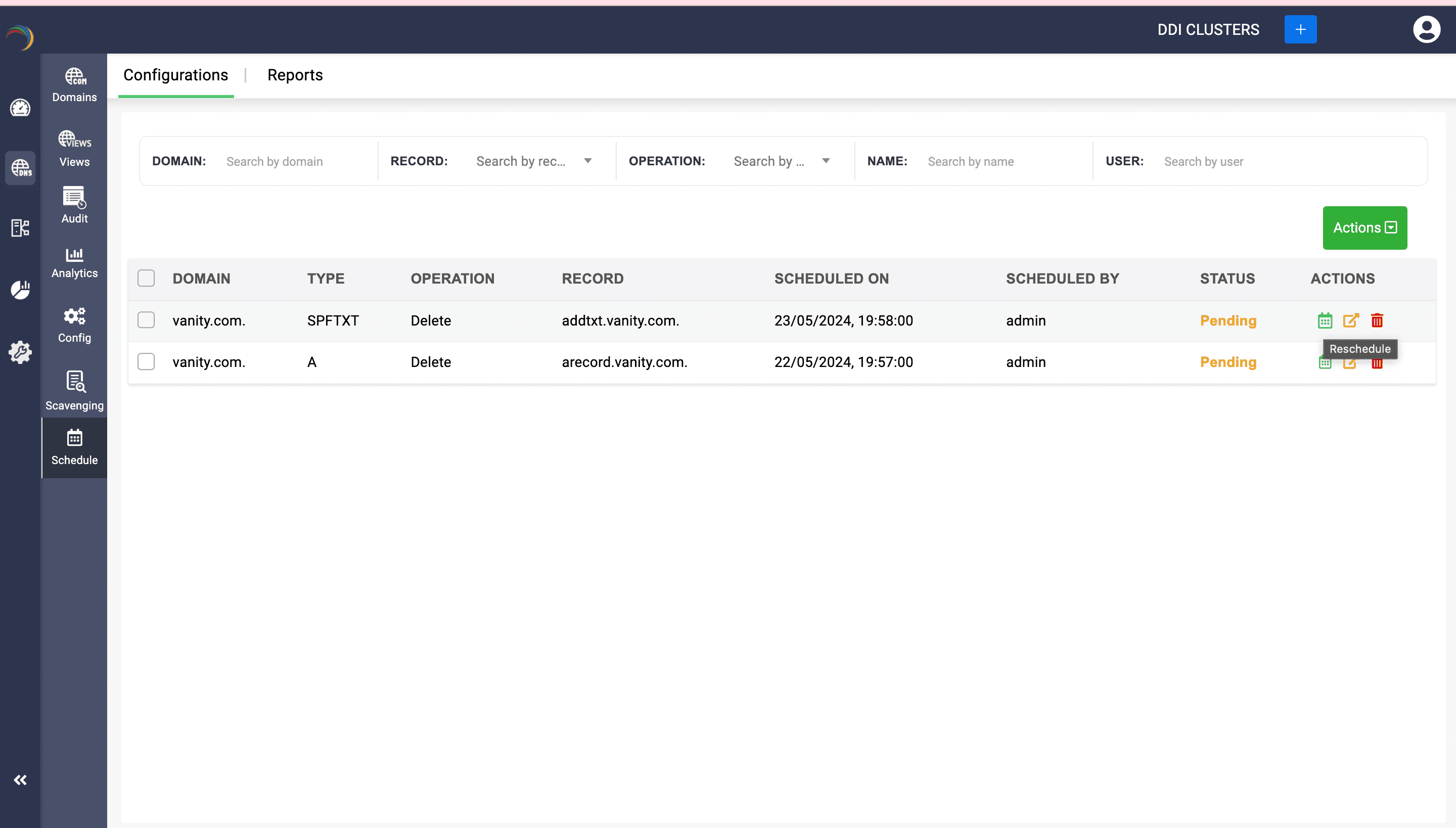 The Configurations tab provides a comprehensive overview of all scheduled DNS records. Here, you can apply filters to search for specific configurations planned for your network and check the status of each scheduled configuration. This tab exclusively allows you to reschedule, view, or delete these scheduled configurations.