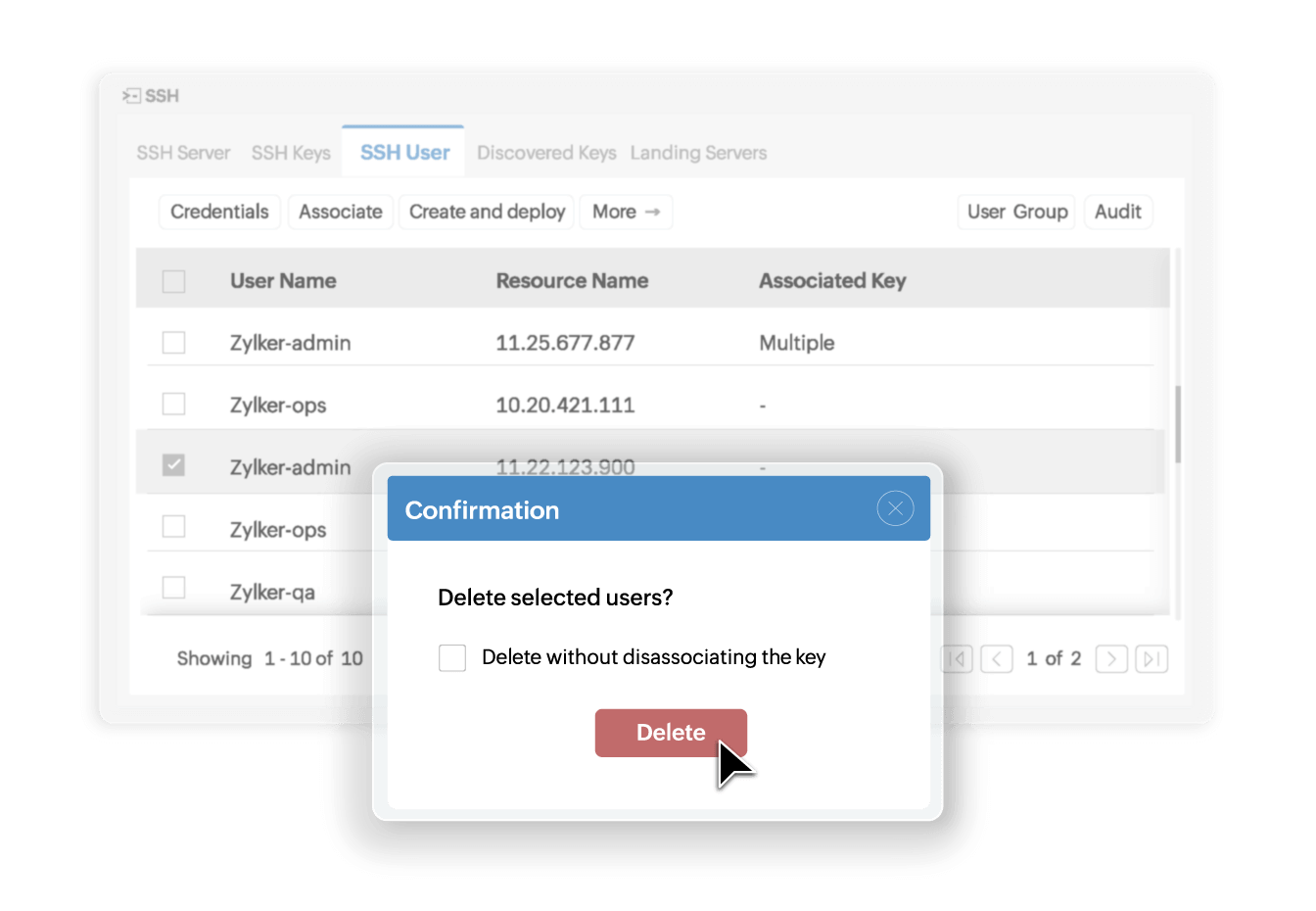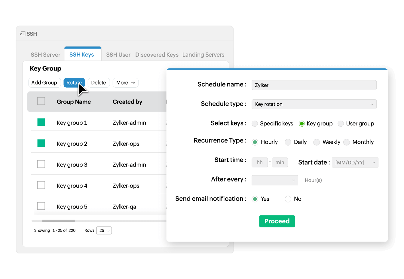 Create groups of SSH keys, users, and resources for easy organization and to carry out bulk operations. Key Manager Plus enables administrators to perform key rotation, deployment, deletion, and association operations on multiple keys, users, and resources simultaneously, eliminating the need for time-consuming repetitive, manual processes.