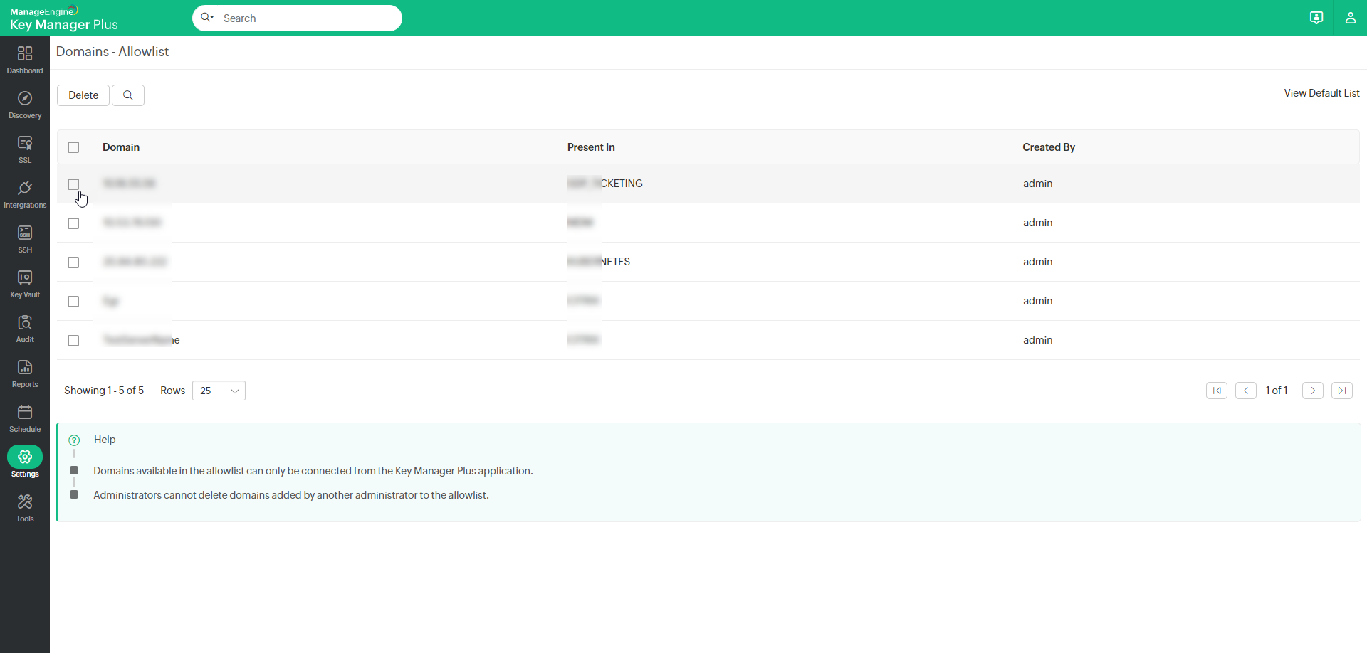 - Exercise caution when deleting a domain from the allowlist as Key Manager Plus will no longer be able to connect to the domains removed from the allowlist.