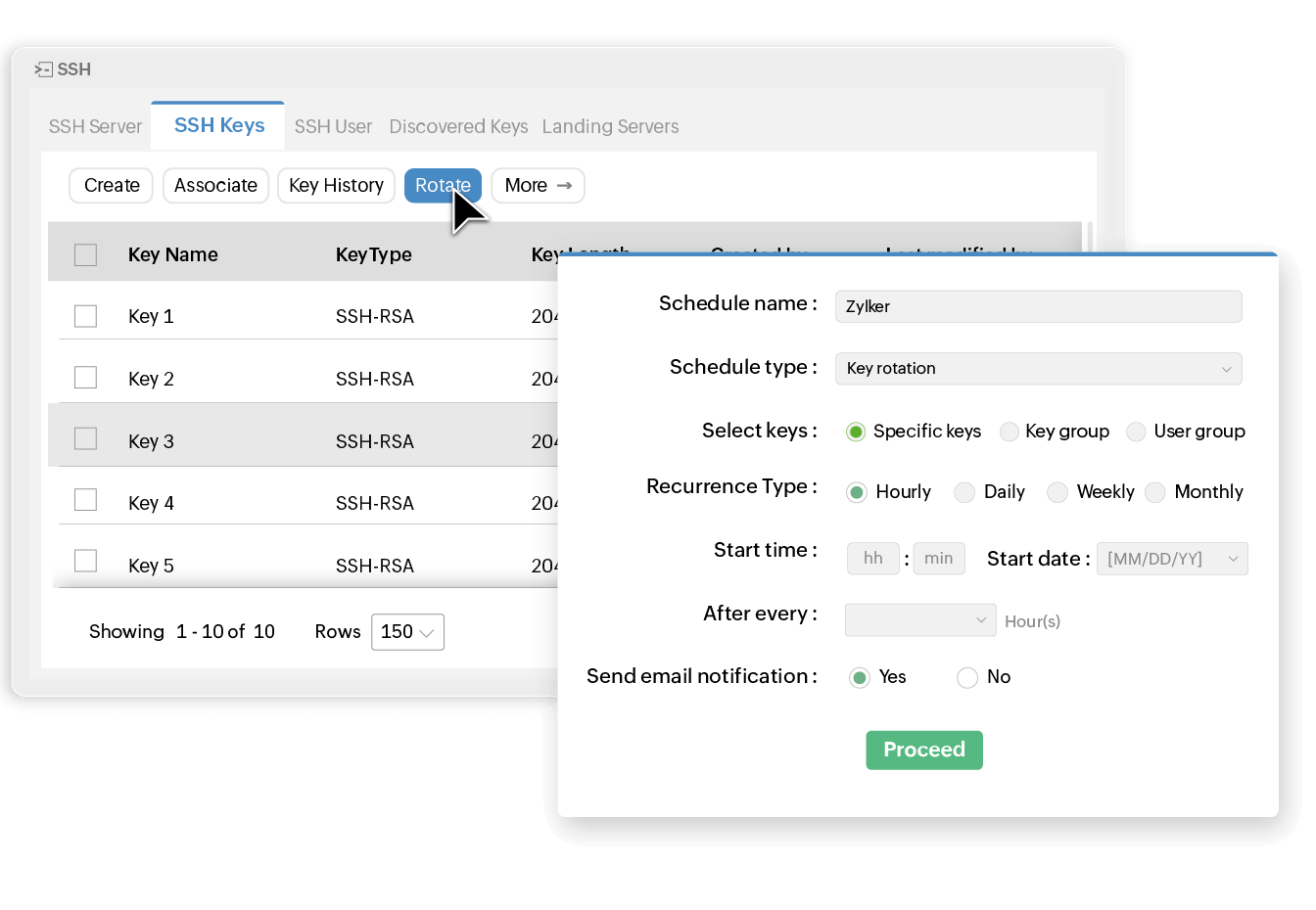 Automate the rotation for your SSH keys at periodic intervals that match your requirements. With Key Manager Plus, you can perform instant key rotations on demand or schedule recurring rotations to happen automatically.