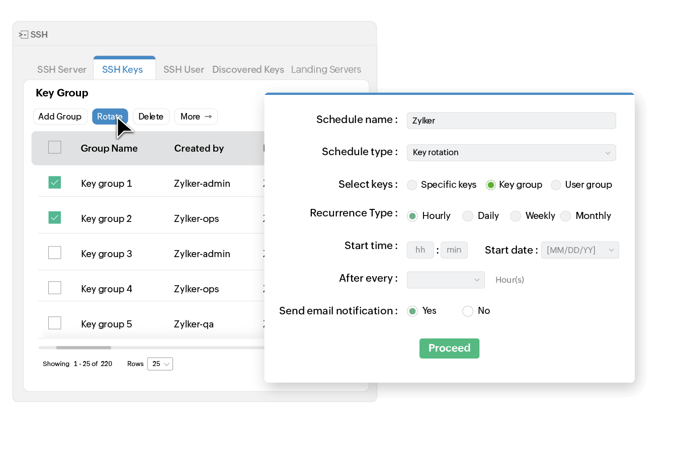 Execute rotation operations efficiently across large volumes of SSH keys in your environment. Key Manager Plus helps you organize keys into groups and perform bulk rotations simultaneously, reducing the time required to update credentials at scale. Further, you can notify stakeholders via email after every key rotation.
