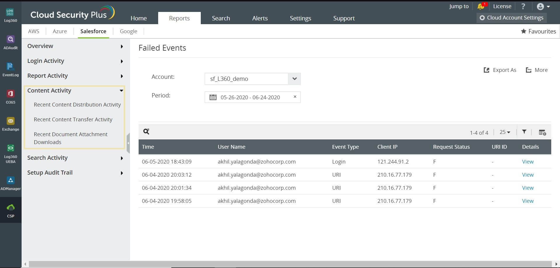Log360 provides real-time alerts and out-of-the-box reports on data access. The solution delivers detailed insights on the content that has been transferred, distributed, and downloaded from the Salesforce application.