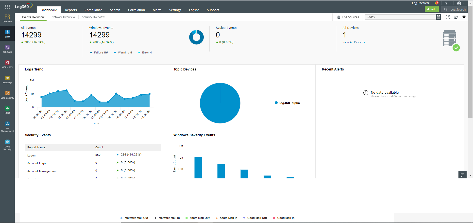 Log360 is an integrated log management solution that helps organizations overcome security challenges and ensures detection and mitigation of threats. It allows you to track Active Directory changes, firewall configurations, network device logs, Microsoft Exchange Server, and Azure AD, all from a single console.