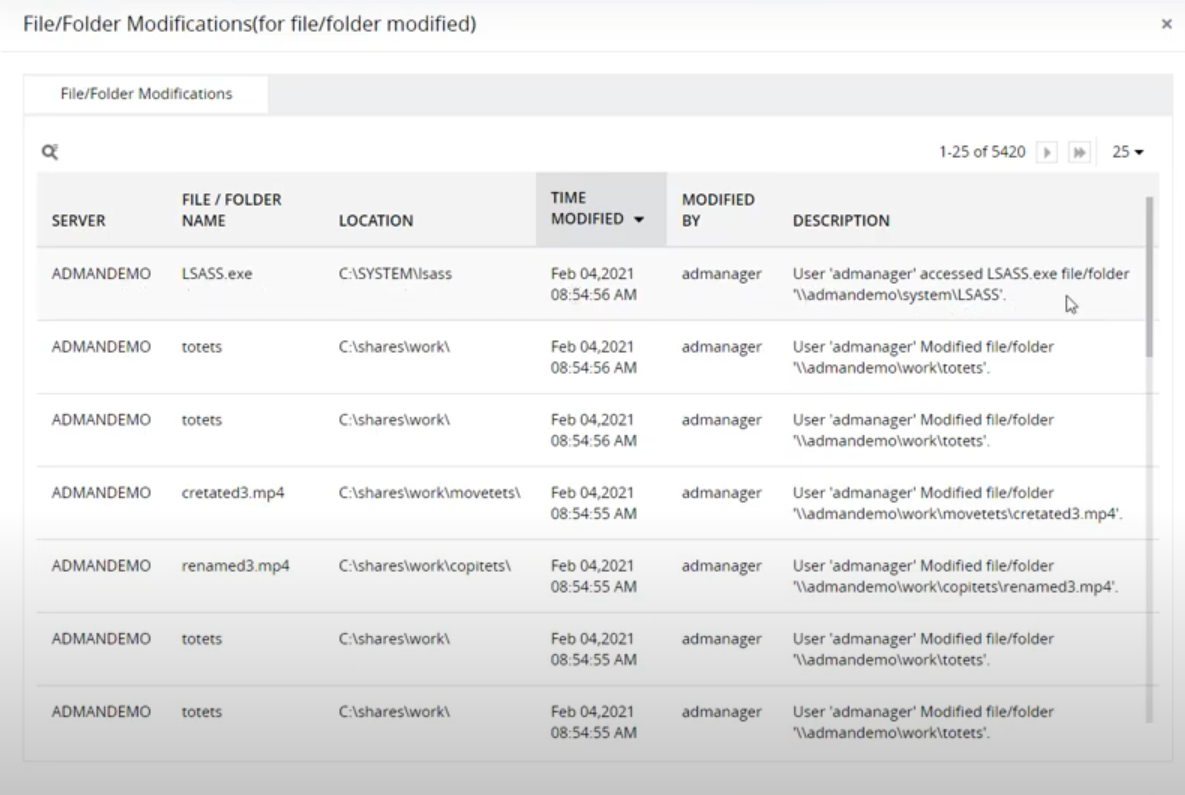 Log360's file integrity monitoring system monitors all accesses, modifications, create, and delete actions on all critical and non-critical files and folders across your network. It also lets you set up alerts to detect critical file accesses or modifications, such as lsass.exe, in real time.