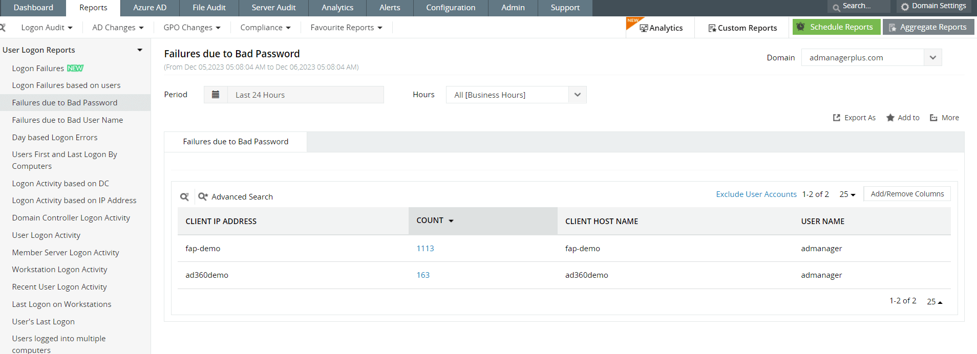 Figure 1: Log360 offers several built-in reports that show logon events, including specific reports on failed logons due to a bad username or password.